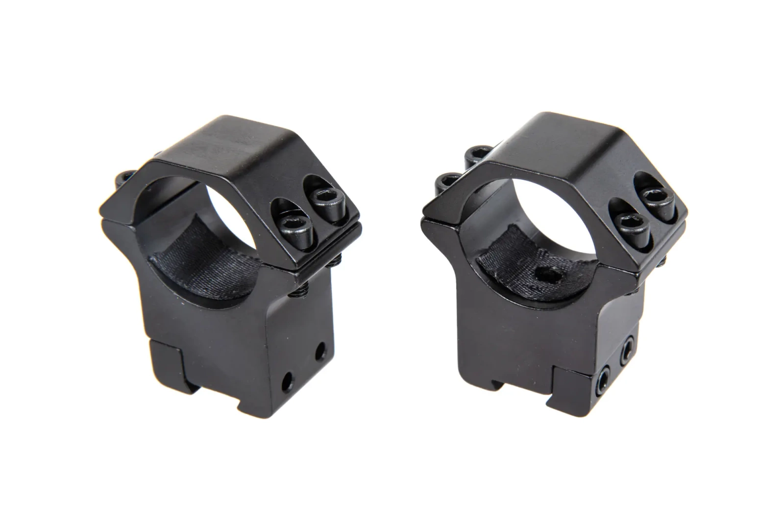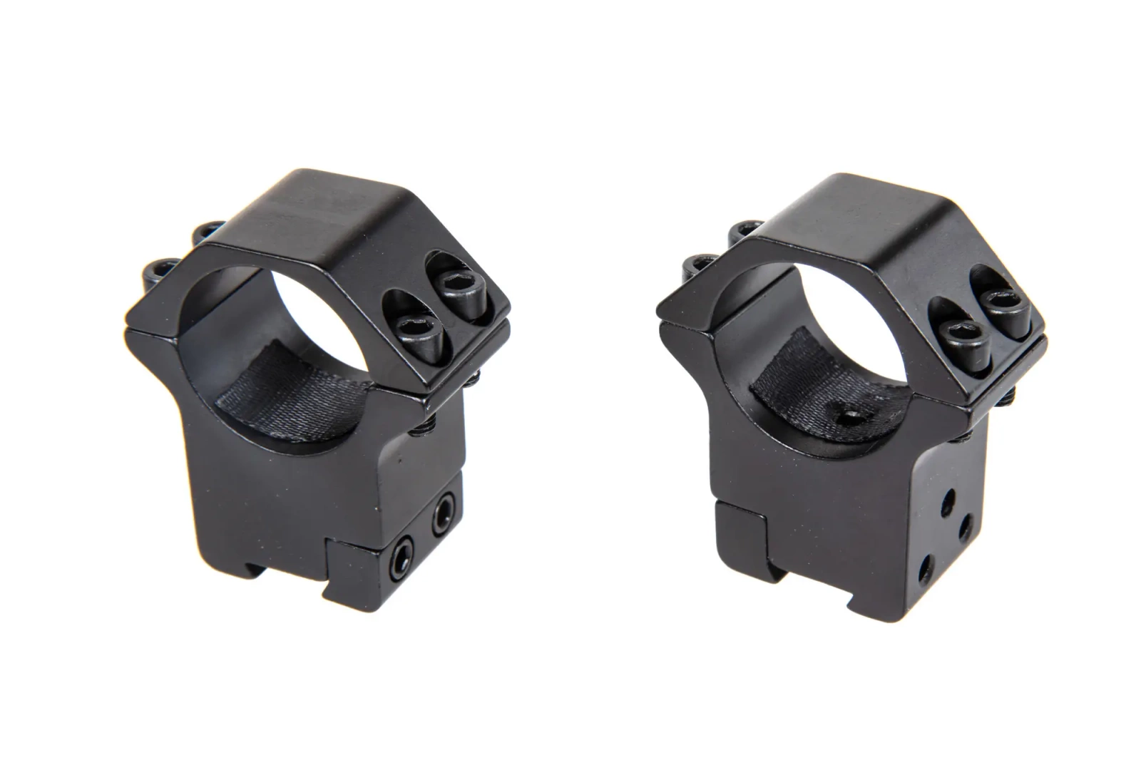 A high-quality set consisting of two mounting rings made of aluminium. A two mounting rings, bolted with four screws each, are responsible for the stable base of the sight.