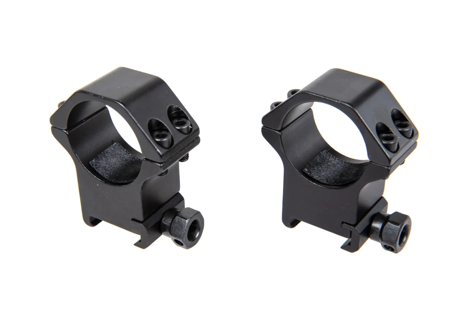 A high-quality set consisting of two mounting rings made of aluminium. A two mounting rings, bolted with four screws each are responsible for the stable base of the sight.