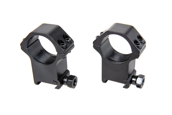 A high-quality set consisting of two mounting rings made of aluminium. A two mounting rings, bolted with four screws each, are responsible for the stable base of the sight.