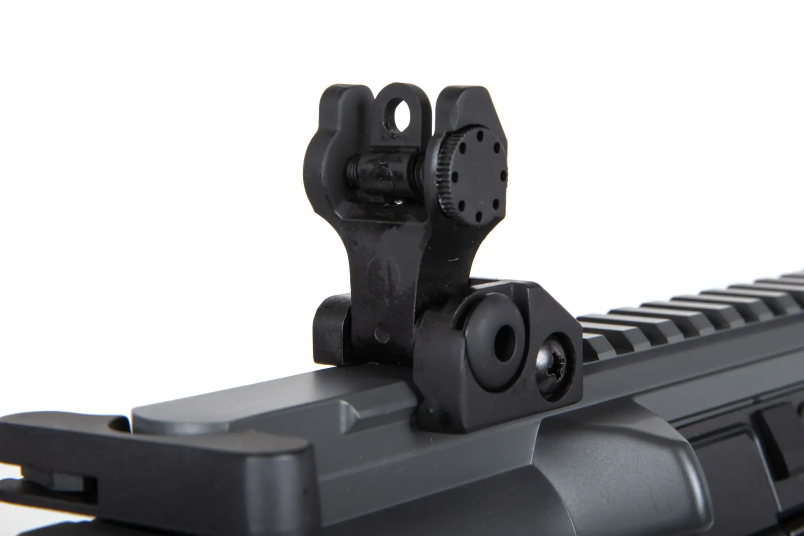 The Upgraded version is equipped with a 22mm RIS dorsal rail, a set of MLOK front rails and an adjustable buttstock. On the upper RIS rail top RIS rail is fitted with flip-up sights, but these can be freely However, they may be freely replaced by any optoelectronic sighting device. aiming device. Thanks to the sliding buttstock finished with a non-slip non-slip texture, it is possible to adjust the length of the replica to the build and preferences of the shooter. the build and preferences of the shooter. The flame suppressor is mounted on a 14-mm left-hand thread, which makes it possible to attach a sound suppressor in its place.