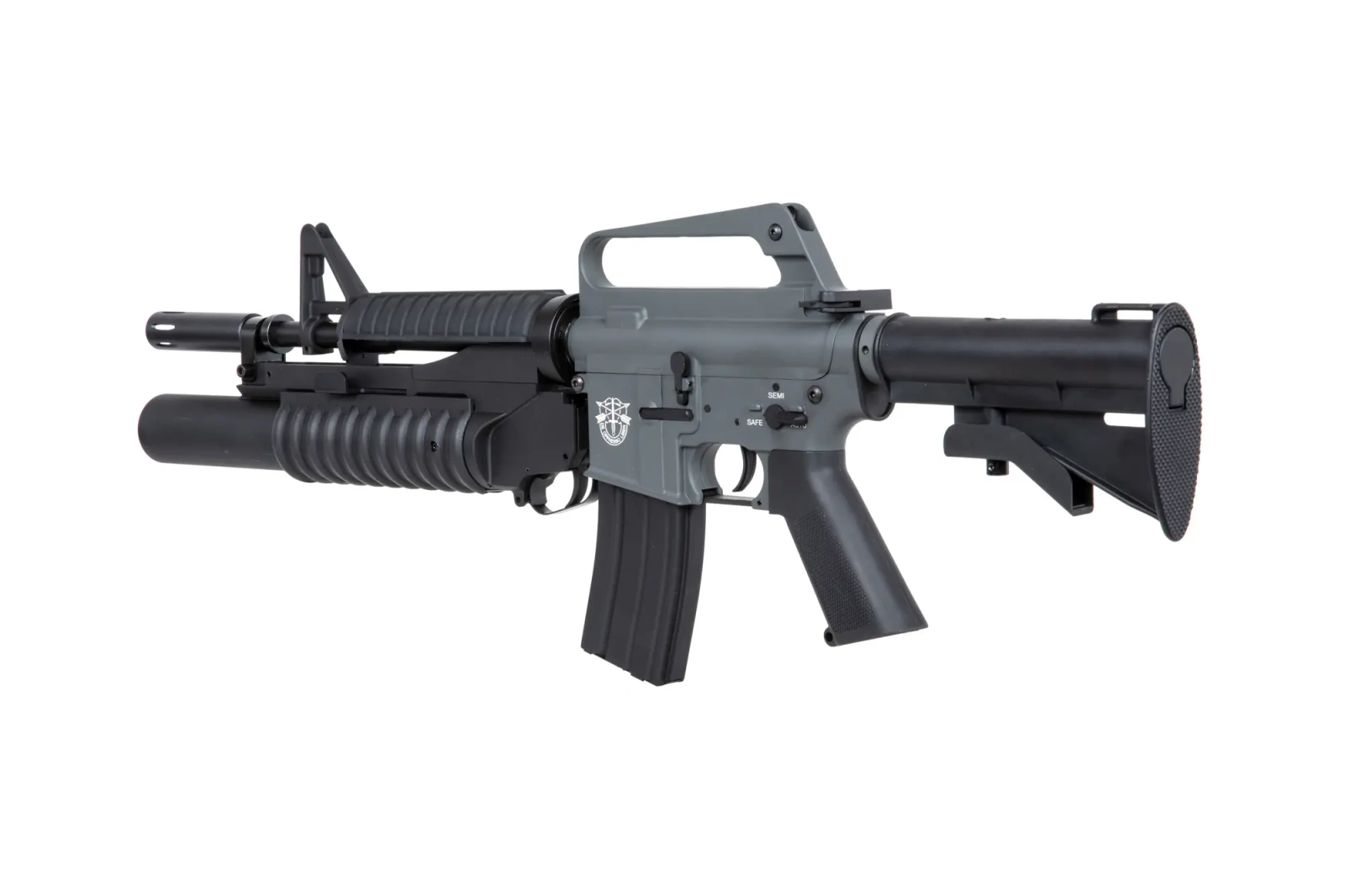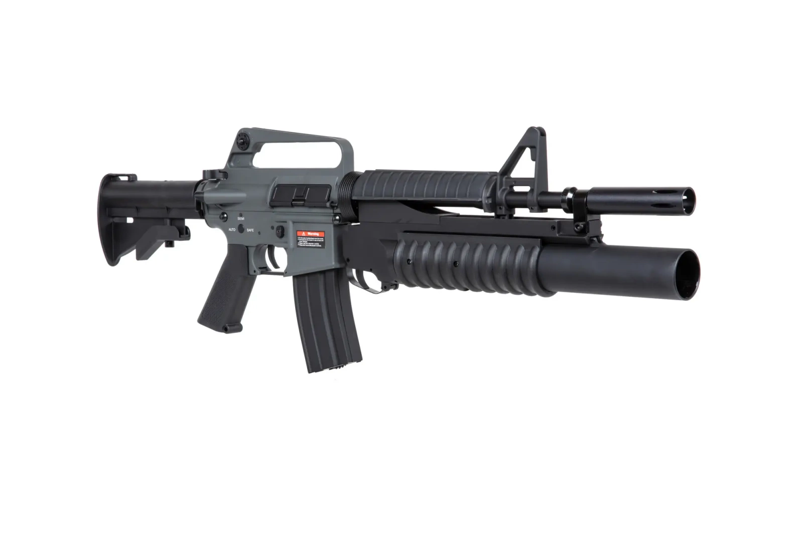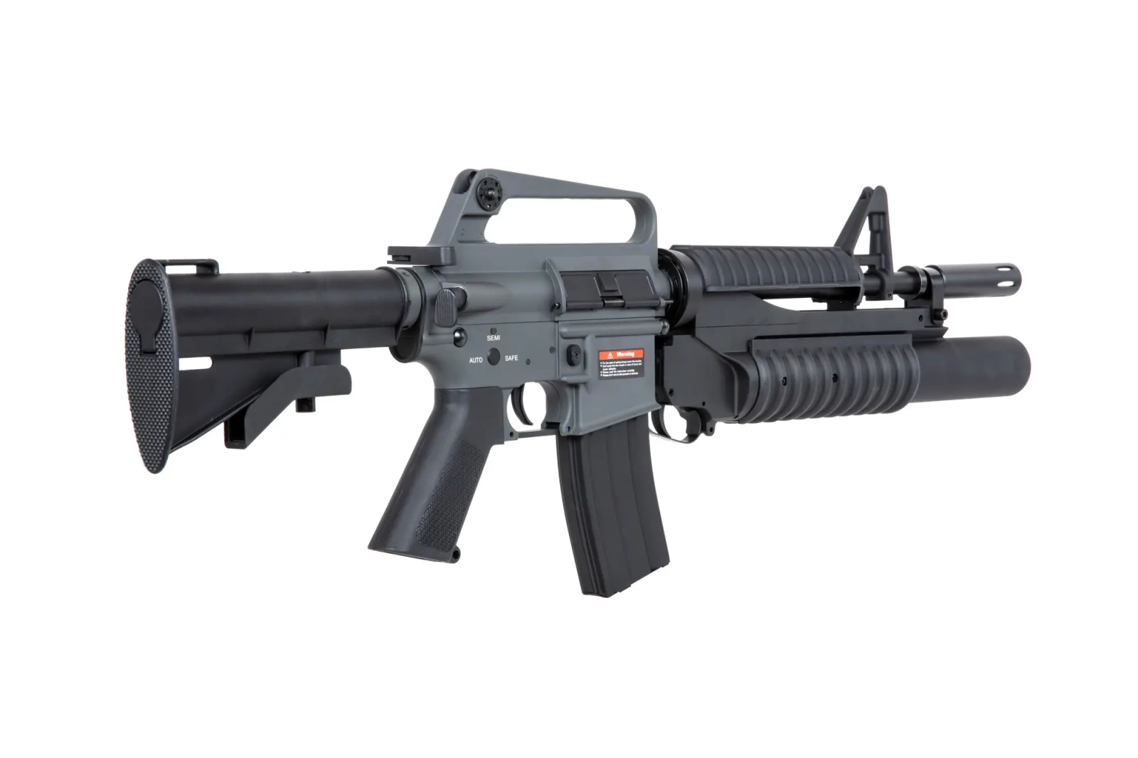 Carbine made of metal and polymer, it is a replica of the XM177E1 carbine with an attached ASG grenade launcher. The carbine is equipped with afunctional bolt-catch, a grip with a rough surface - useful especially in hot weather, an adjustable stock and a hi-cap magazine.