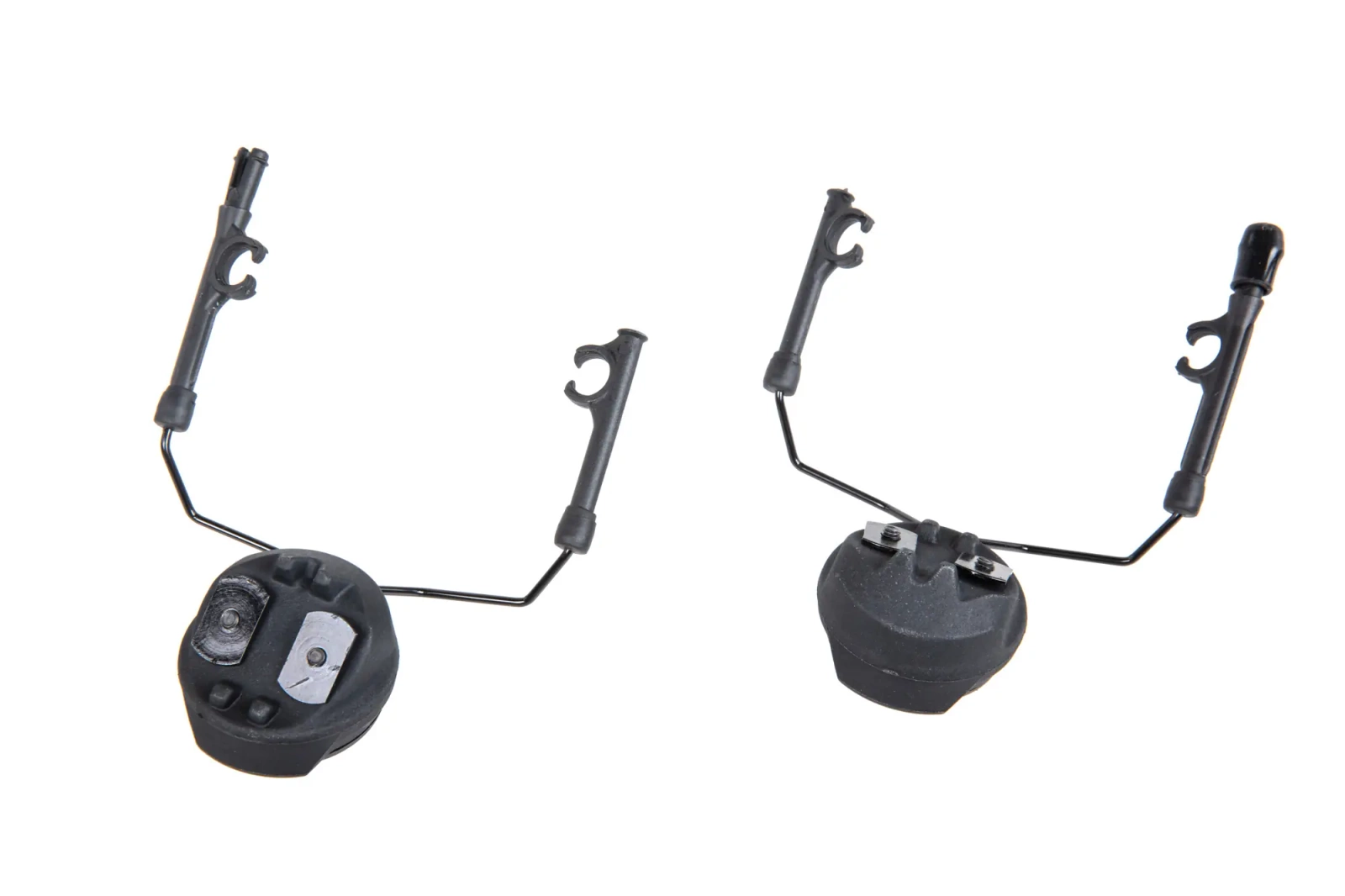 An adaptor allowing the attachment of Comtac and similar headsets to the rails of helmets equipped with MTEK type rails.