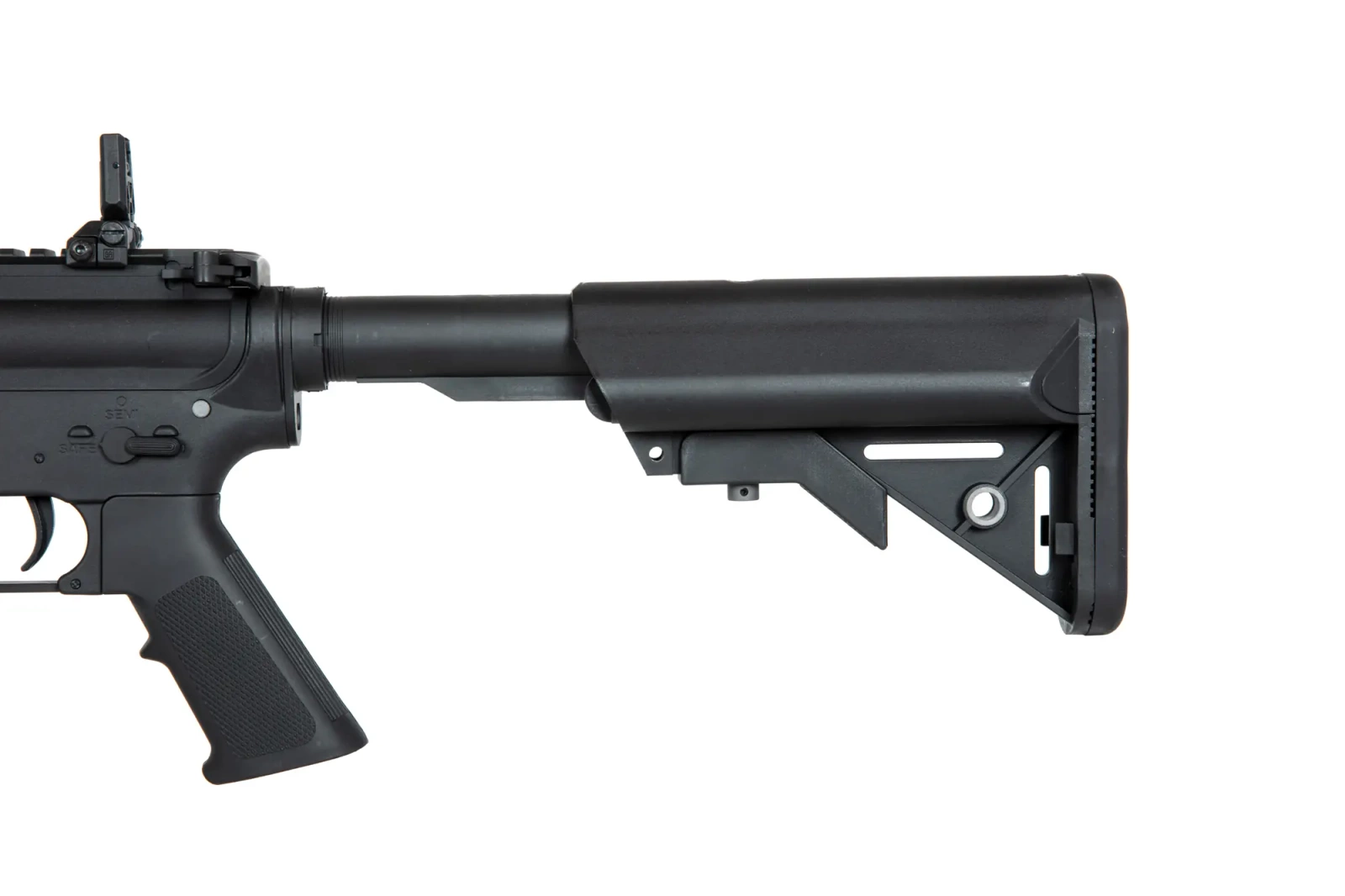 The replica is equipped with a 22mm dorsal RIS rail, a set of front RIS rails and an adjustable buttstock. A folding sight has been fitted on the upper RIS rail, which does not interfere with optoelectronic sighting devices. Thanks to the extendable buttstock finished with a foot with an anti-slip texture, it is possible to adjust the length of the replica to the build and preferences of the shooter. The standard flame suppressor is mounted on a 14-millimetre left-hand thread, which makes it possible to attach a sound suppressor in its place.