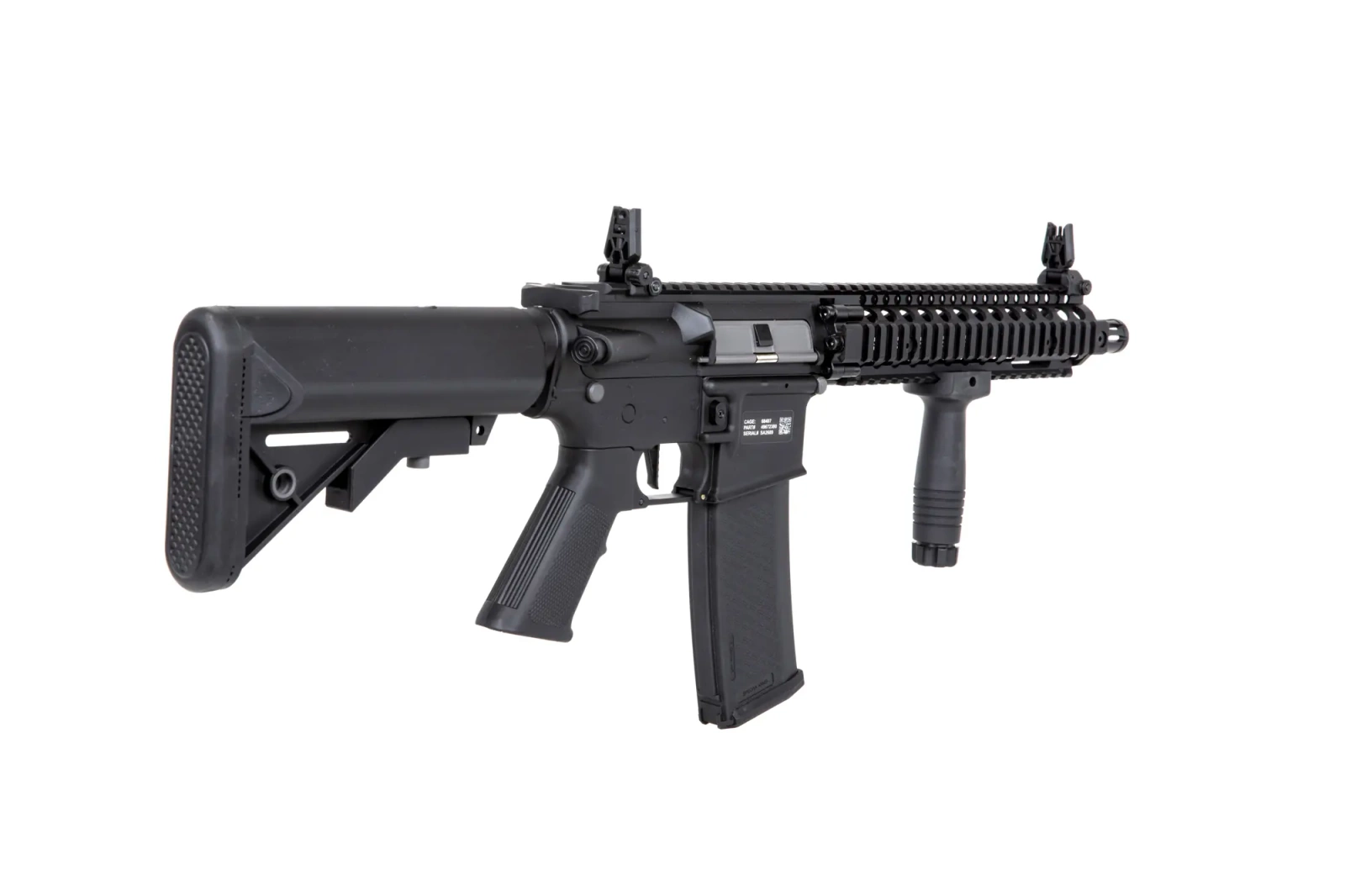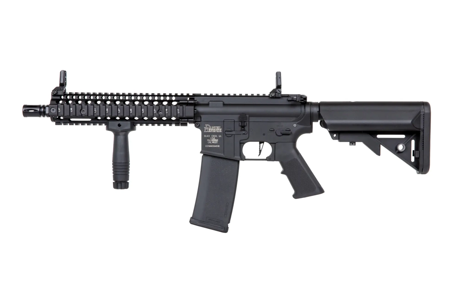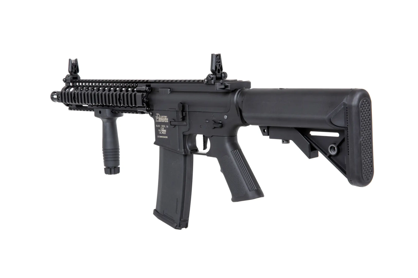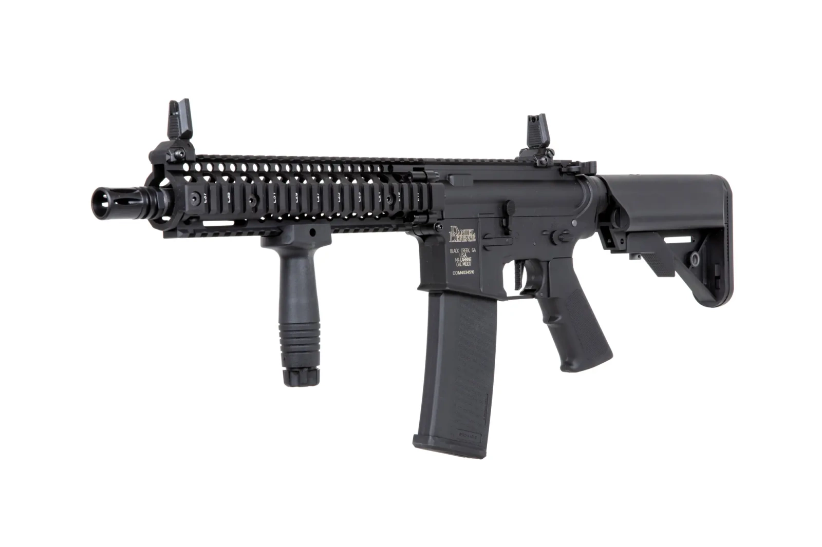 The replica is manufactured in collaboration with the American brand EMG Arms. It features licensed markings Daniel Defense® - a US-based firearms manufacturer that has specialised in supplying a variety of AR15 variants and accessories since 2002, including for USSOCOM special orders.