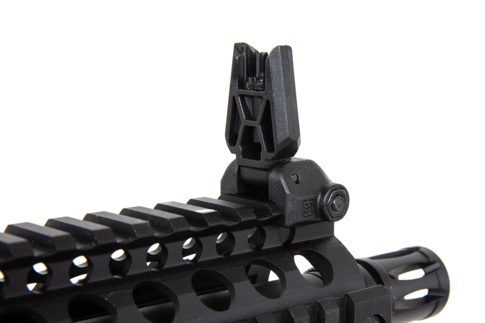 The SA-C19 airsoft rifle is equipped with a front rail in the RIS22mm mounting system. The barrel is finished with a standard exhaust device seated on a 14mm CCW thread. On the back of the replica are placed folding sighting instruments.