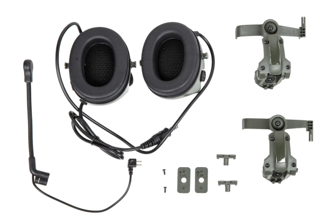 The tactical headset is designed for users who value comfort and convenience. For this reason, the headband has been dispensed with and instead the kit includes a helmet-mounted headphone adapter, which has been equipped with ARC/TW type rails.