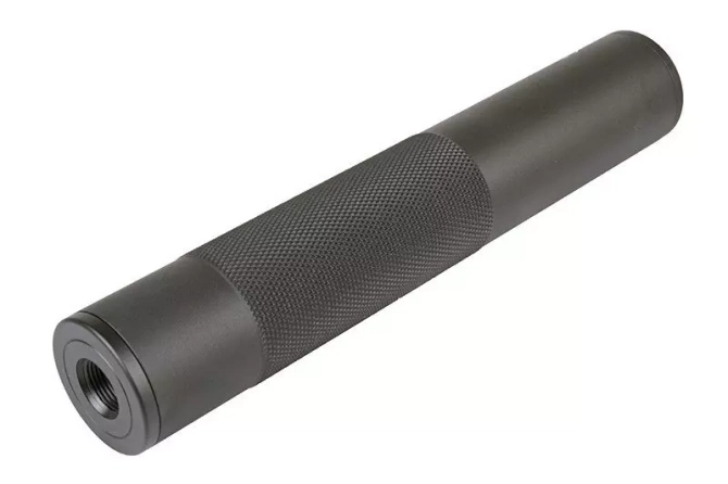 A metal silencer, compatible with any replica featuring a barrel with a 14 mm thread.