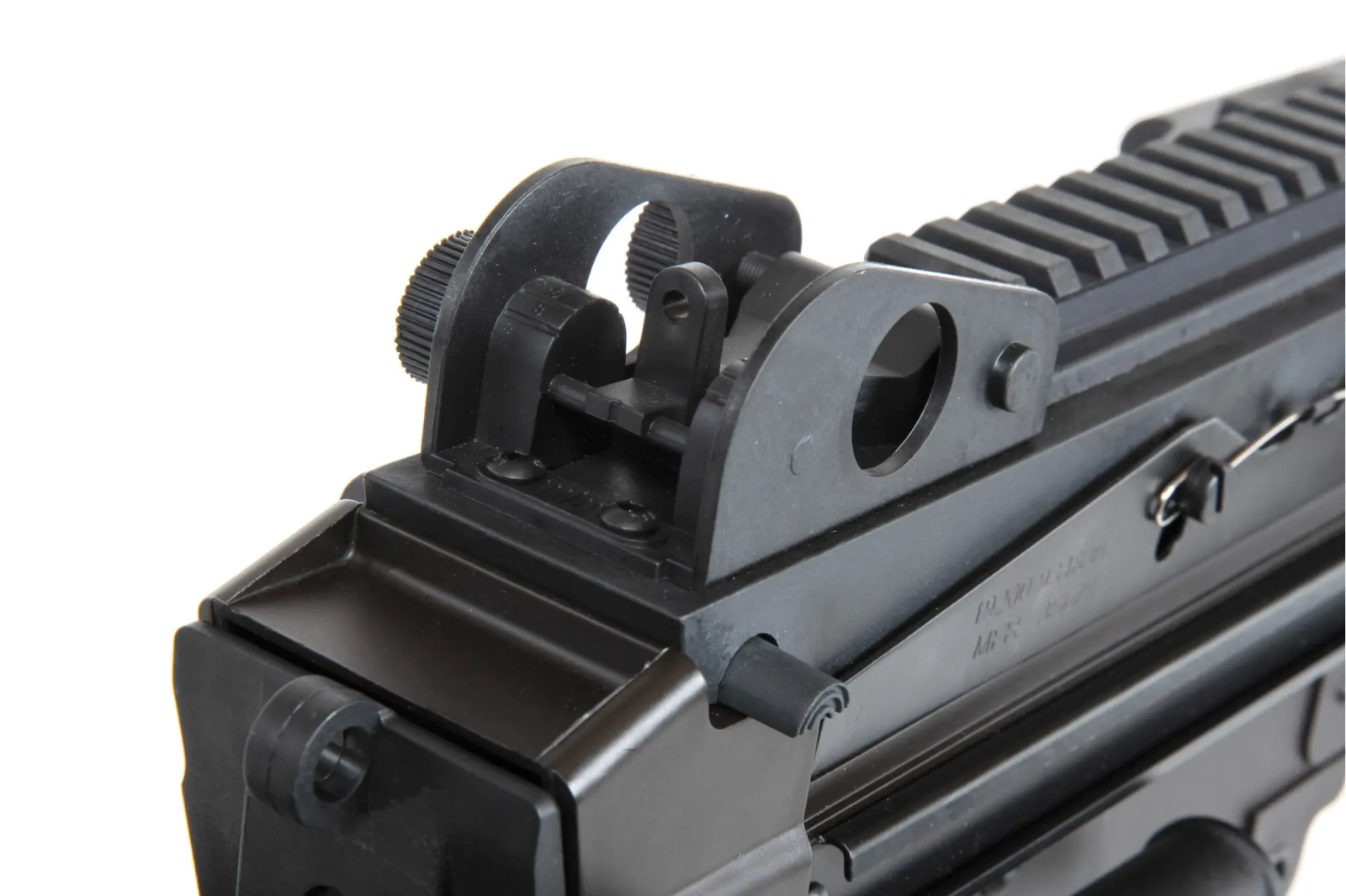 The replica is made of metal and high-quality plastic. The stock, pistol grip, body, handguard, and magazine are made of polymer. The remaining parts are made of a zinc-aluminium alloy.