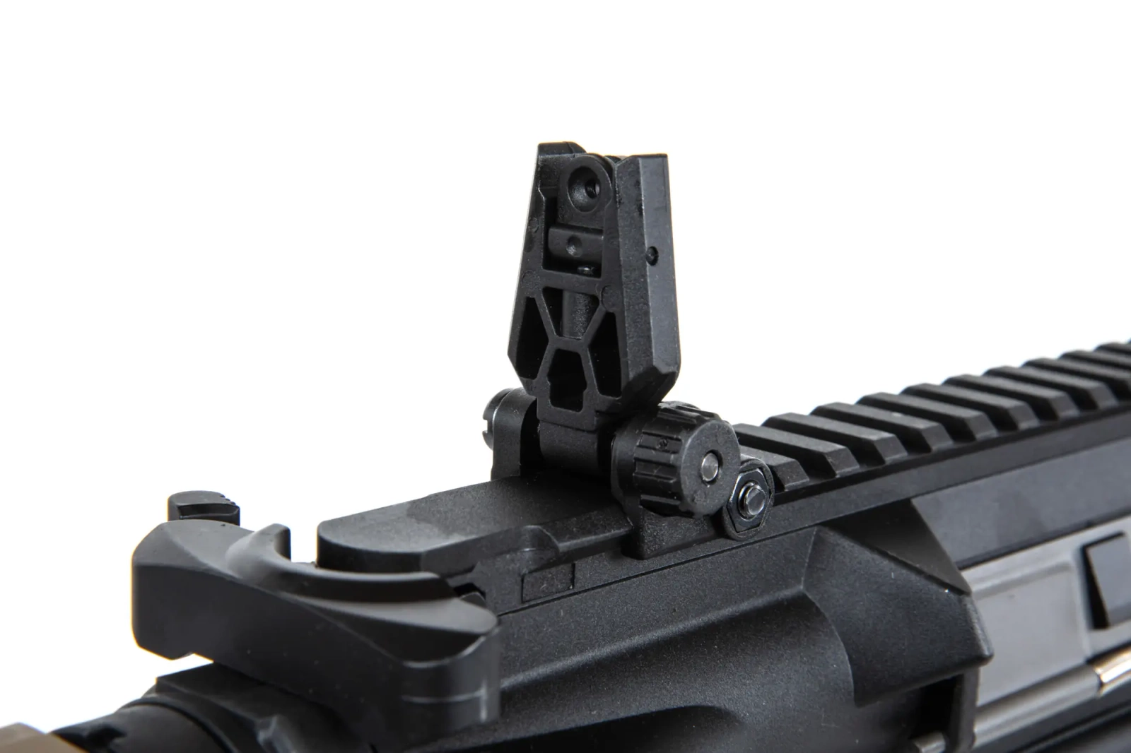 The replica is equipped with a 22mm dorsal RIS rail, a set of front RIS rails and an adjustable buttstock. A folding sight has been fitted on the top RIS rail, which does not interfere with optoelectronic sighting devices. Thanks to the extendable buttstock finished with a non-slip textured foot, it is possible to adjust the length of the replica to the build and the shooter's preferences. The standard flame suppressor is mounted on a 14-mm left-hand thread, which makes it possible to attach a sound suppressor in its place.
