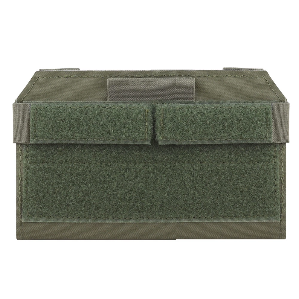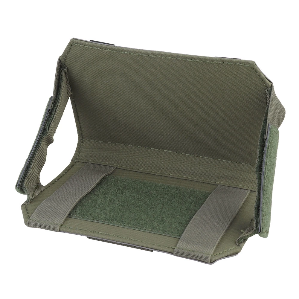 A foldable phone holder that mounts onto MOLLE, made from 500D Cordura. The model features a patch panel and a security strap. Upon opening the panel, a Velcro panel and elastic straps are revealed, making it ideal for securely carrying a smartphone or navigator.