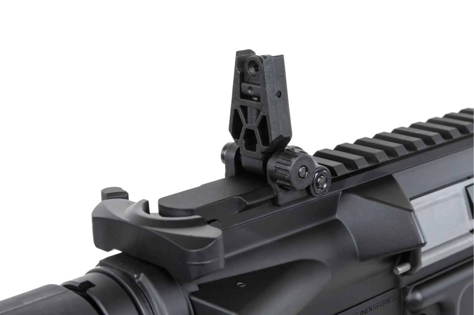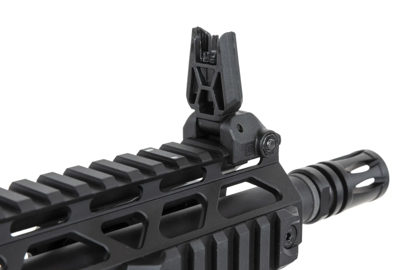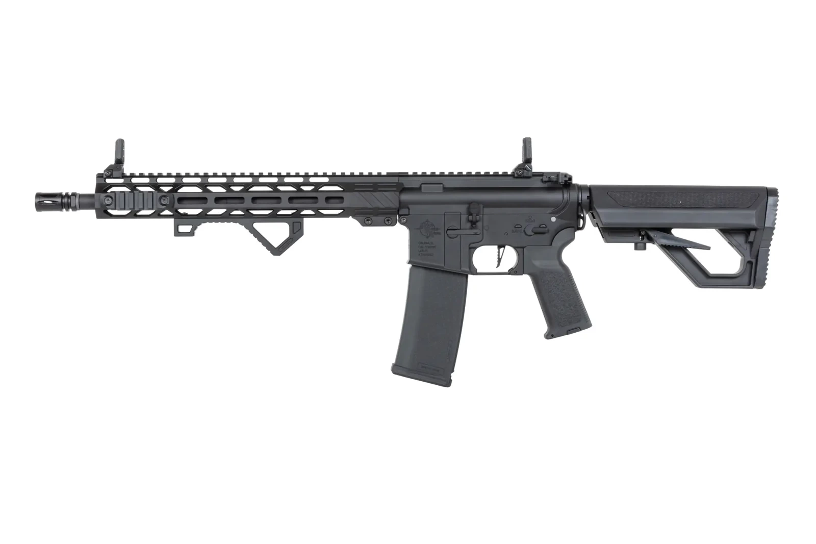 The replica is fitted with a front RRA Lightweight Free Float Rail in the M-LOK standard licensed by Rock River Arms®, and the barrel is terminated with a standard discharge device mounted on a 14mm CCW thread. On the back of the replica, folding sighting instruments are located.