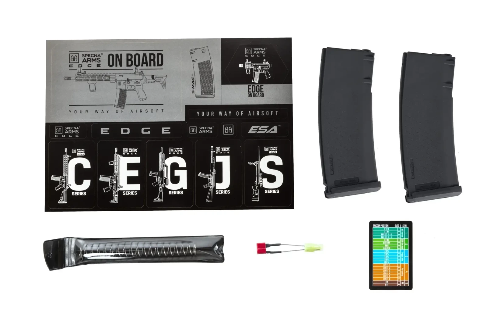 Included in the box with the replica are two S-MAG mid-cap magazines with a capacity of 125 rounds each. The S-MAG is an exclusive polymer magazine designed by Specna Arms. What draws attention is the distinctive texture composed of Specna Arms logos. The S-mag ensures trouble-free ball feeding, even at high ROF.