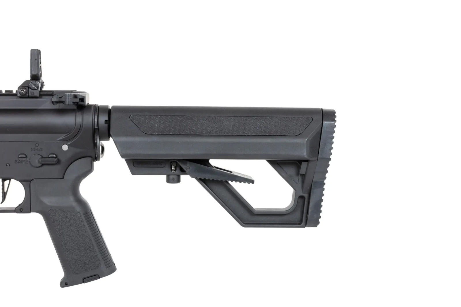 The model was fitted with an adjustable Heavy Ops stock. The Heavy Ops stock has been fitted with an enlarged stock foot and rubber panels with a non-slip texture. The stock design itself has been enlarged so that it seamlessly accommodates high-capacity batteries while maintaining an ergonomic shape.
