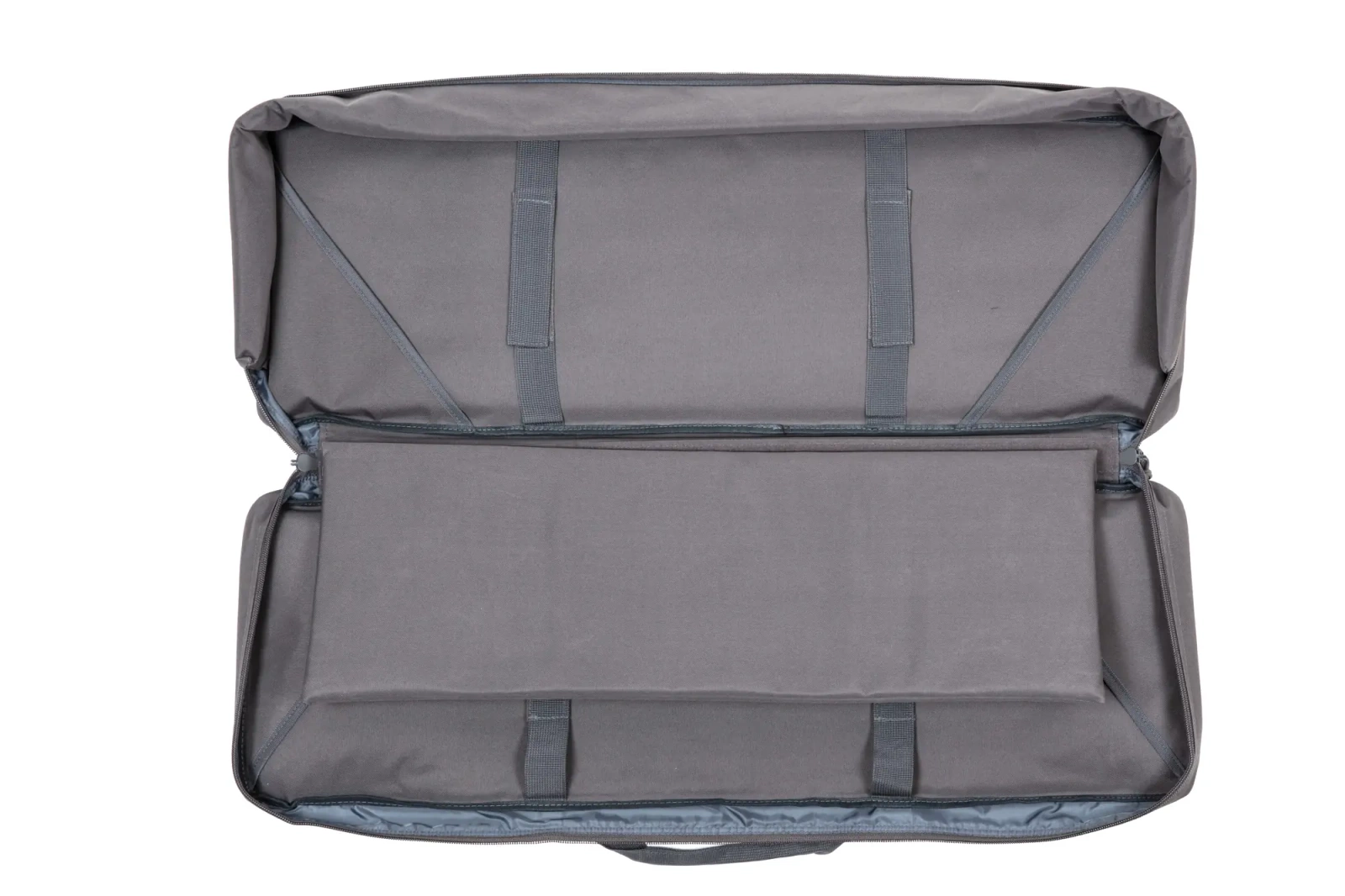 The main compartment, with internal dimensions of 87x30x8 cm, is equipped with straps to immobilise the replica and reinforced walls made of soft material to prevent mechanical damage. Inside, there is a removable wall, allowing the safe separation of two replicas or, in the case of a larger replica such as an LMG, increasing the capacity of the chamber.