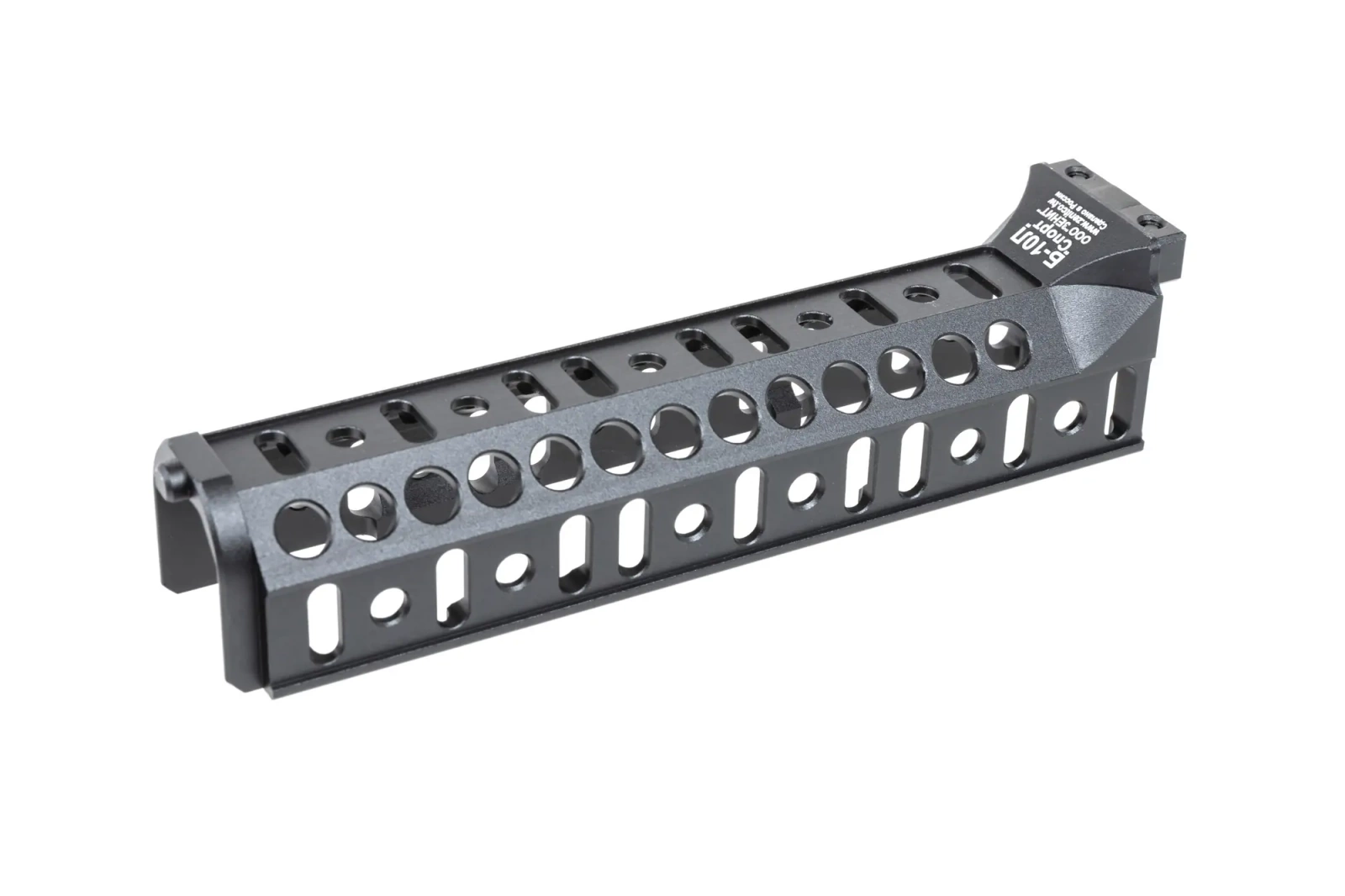 The handguard is equipped with a Zenitco-type mounting system (the eastern answer to the KeyMod and M-LOK mounting systems), allowing different length rails to be mounted anywhere.