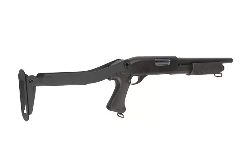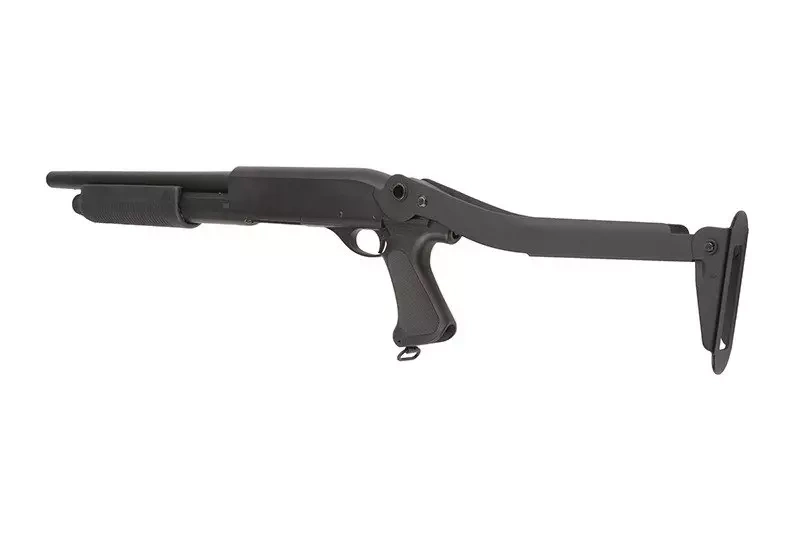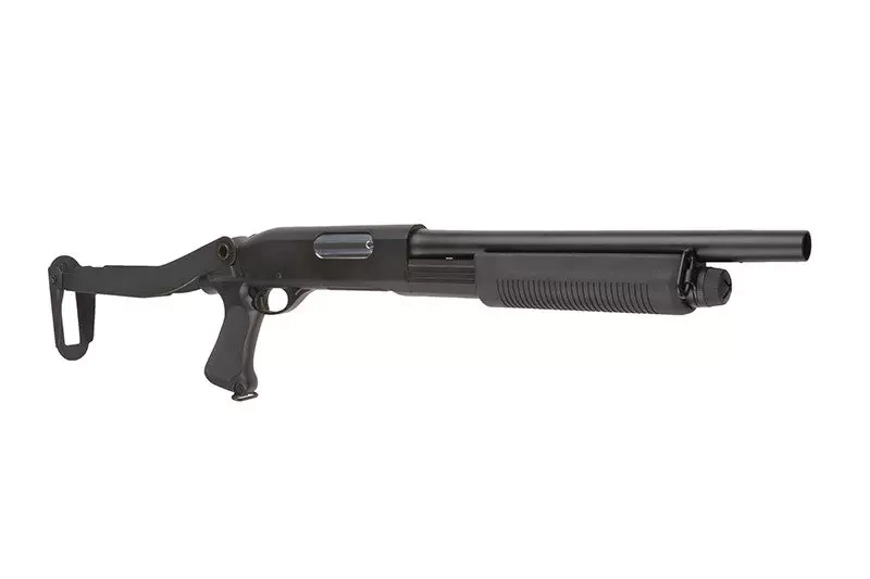 Safety and shell chamber plate lock are located next to the trigger, which makes their operation quick and intuitive. CM352 has a foldable, steel stock that folds upwards, onto the top of the receiver. This allows to rapidly decrease the replicas size, for instance, for transport or apt operation in tight spaces.