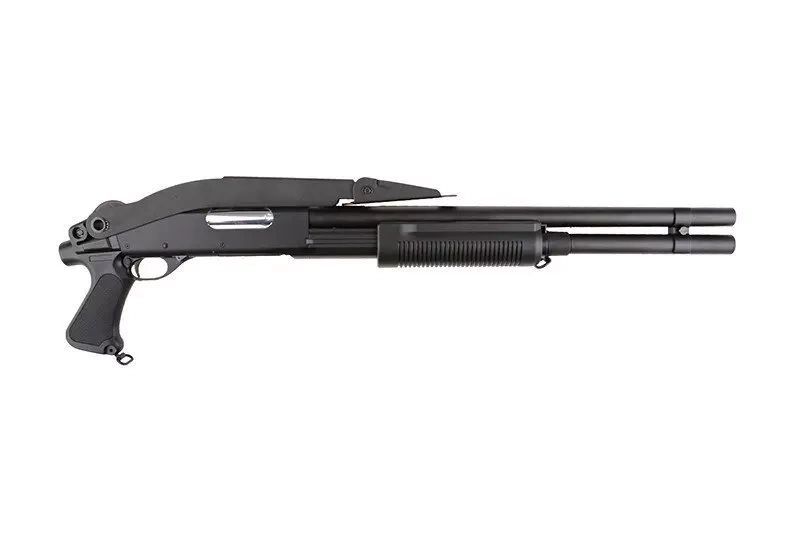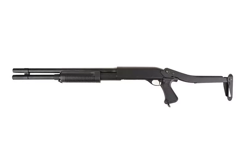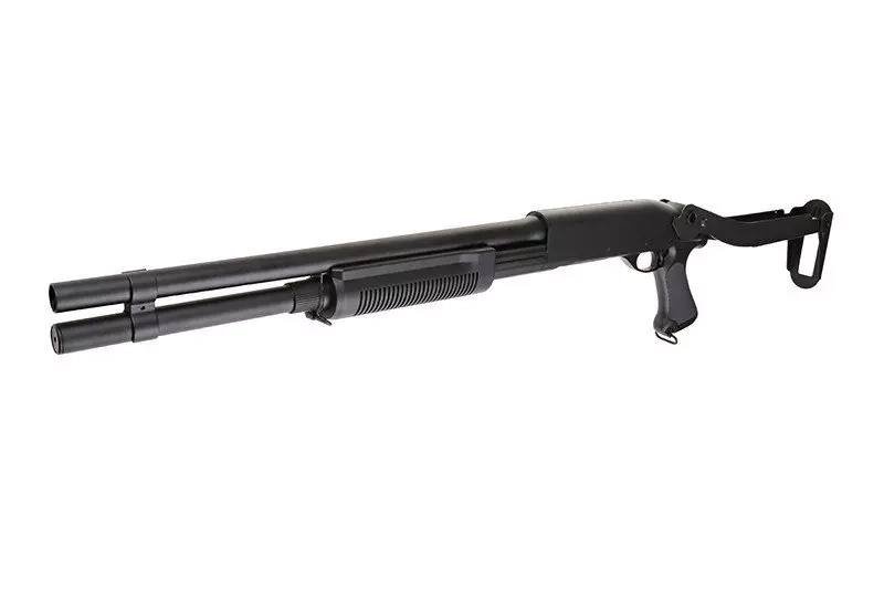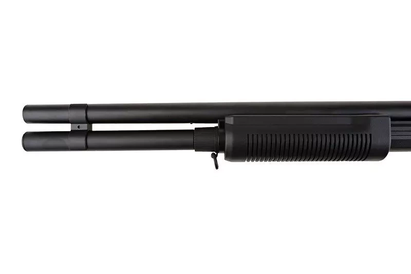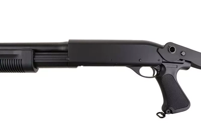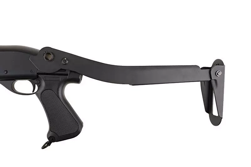 Specific elements of the replica have been very well fitted together. Parts made from ZnAl include: inner barrel, grip slide, shell ejection flap, tactical sling swivels, barrel clasp, bullet chamber flap. A collapsible stock was made from steel. Remaining parts such as pistol grip, body, sliding forearm handle were made from durable polymer.