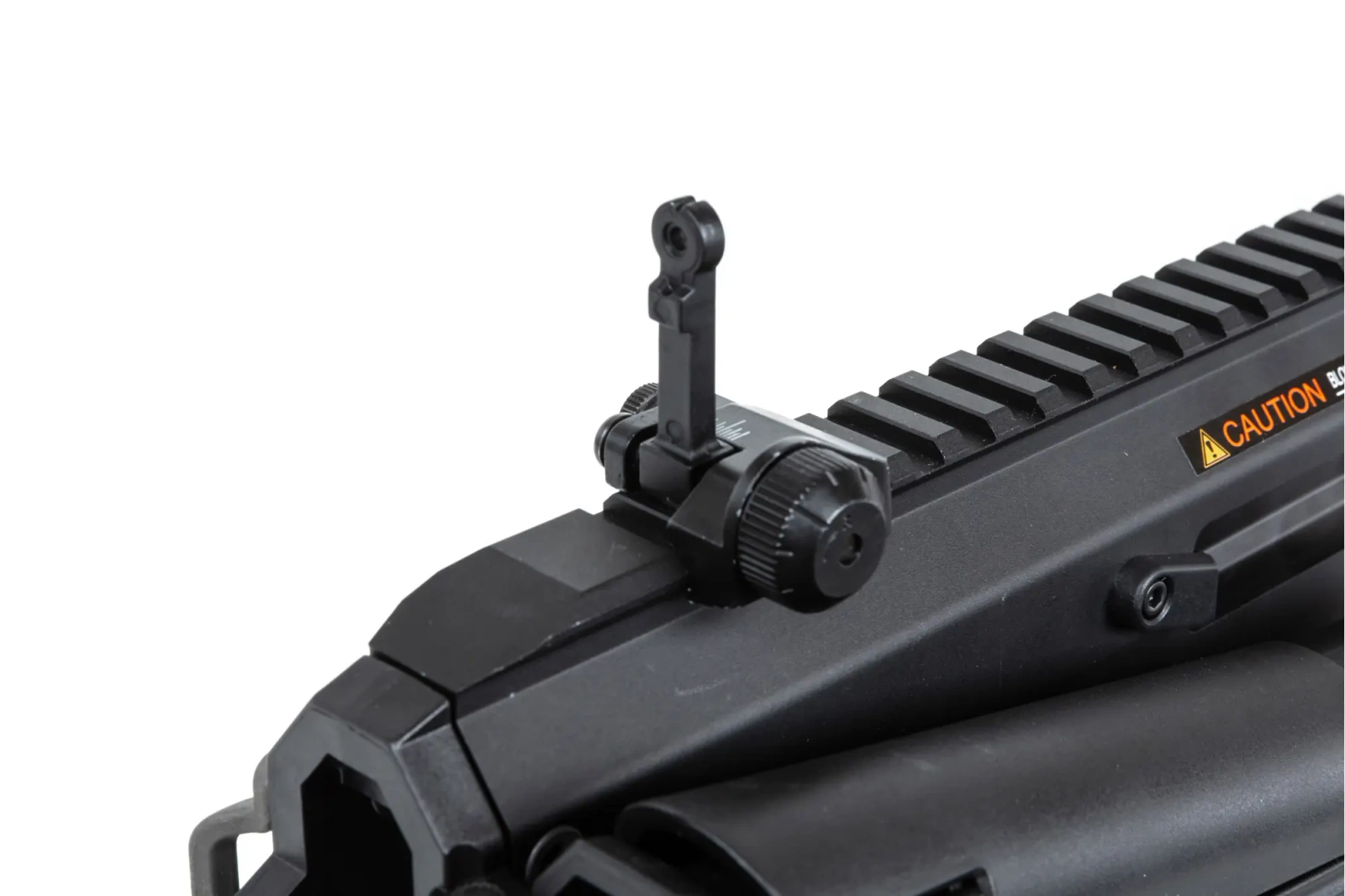 Made of metal are: Body, flame suppressor, CNC dorsal RIS rail, 9.5 inch lightweight M-LOK handguard, folding sights, tactical sling eye and all pins and screws (the eye including the pins and screws are steel). The following components are made of polymer: Ergonomic pistol grip, which has a rough surface - ideal when playing in warmer weather when the hand may be sweaty, magazine, manipulators and adjustable stock including the SF1 tank.