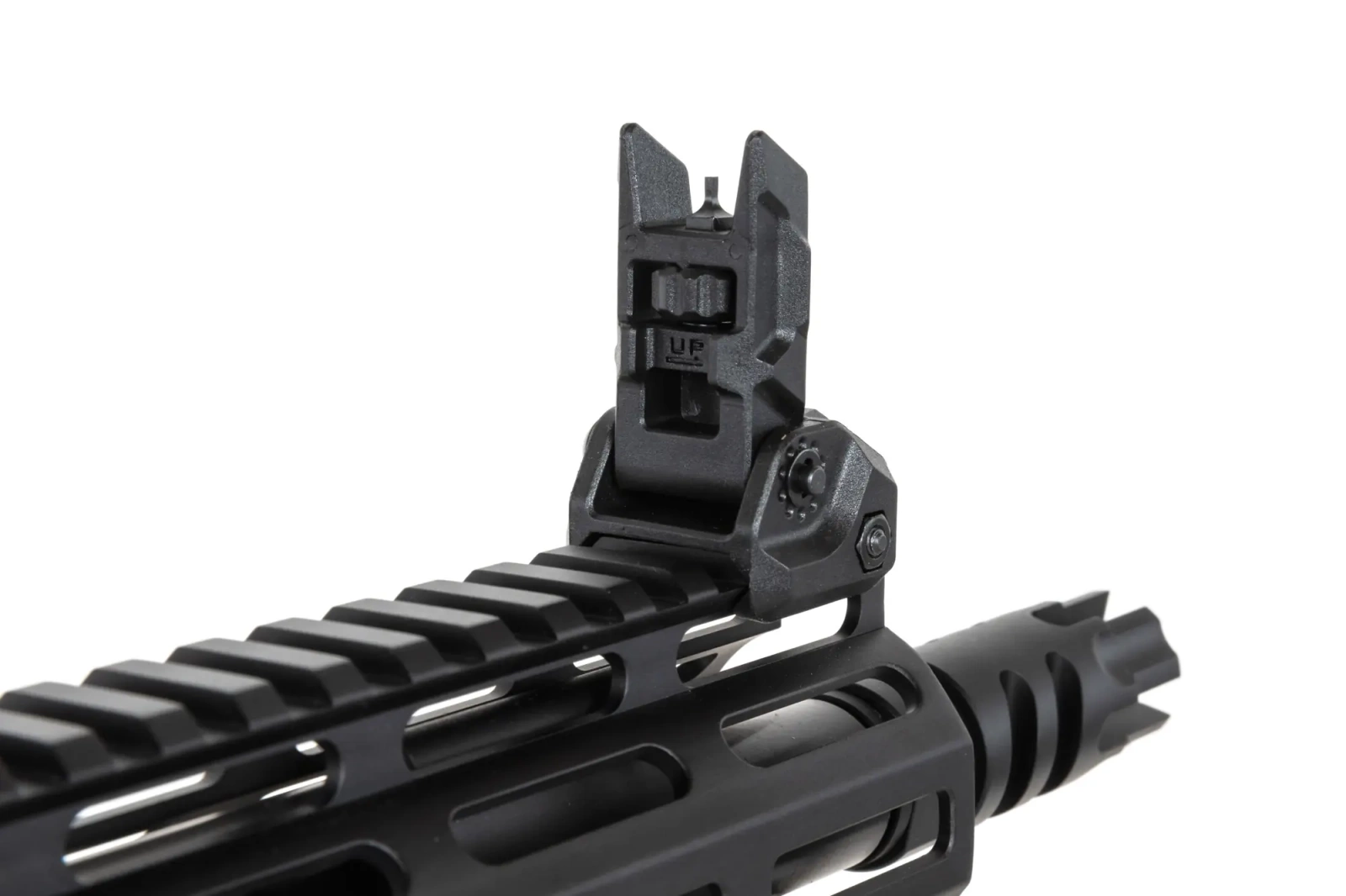From the polymer , we will experience an adjustable stock, pistol grip with rough surface, mid-cap magazine, mechanical sighting instruments.