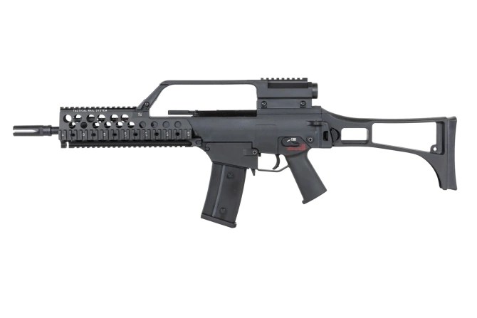 The airsoft SRC DUAL POWER SR36 KSK COB-303 carbine ,modelled on the famous design, has the aforementioned scope, on which an additional RIS rail has been mounted. A further 4 CNC-created RIS rails can be found on the carbine's handguard - this will allow a vertical grip, bipod, laser, torch, etc. to be mounted on the product. The GB-303 has a side-folding buttstock, a double-sided fire selector and a reloading handle on both sides.