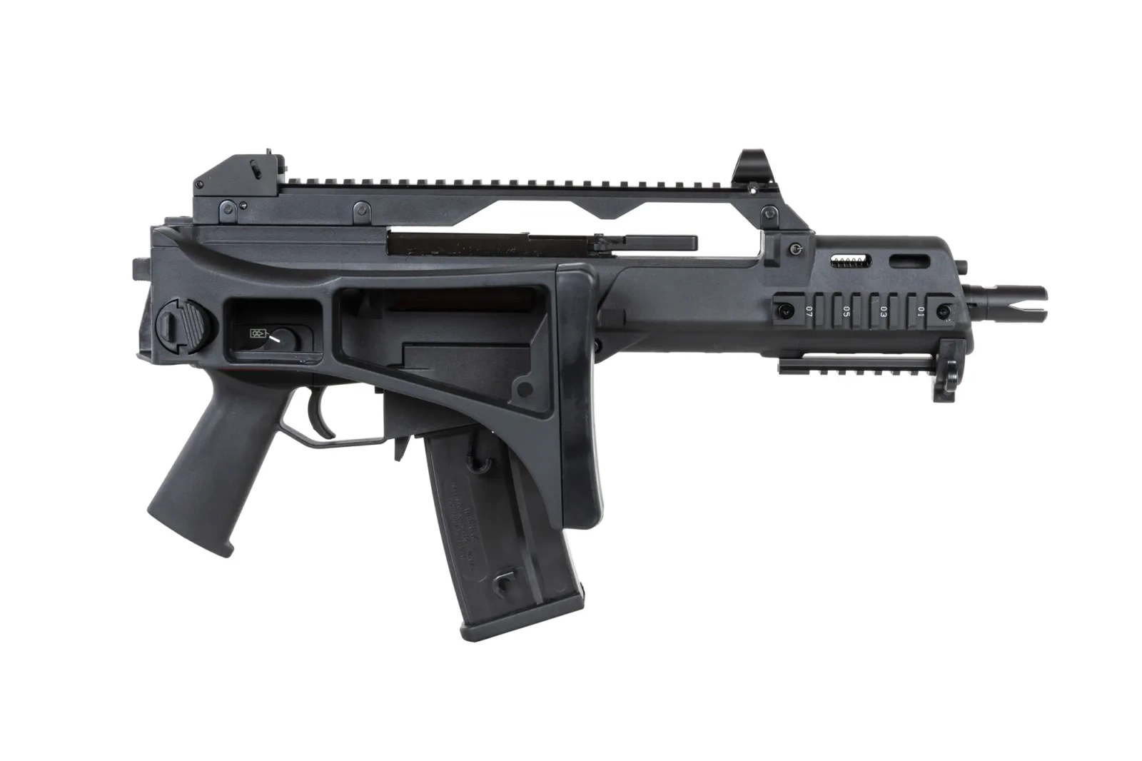 The SRC DUAL POWER SR36C GB-306 airsoft carbine , modelled on the famous design, has a RIS dorsal rail, which will allow mounting of e.g. optics, but at the same time 3 additional RIS rails on the handguard, which will allow mounting of a vertical grip, laser, torch, etc. The replica is equipped with a side-folding buttstock, which is important as it will allow to shorten the carbine during e.g. transport, as well as double-sided reloading levers and a fire selector.