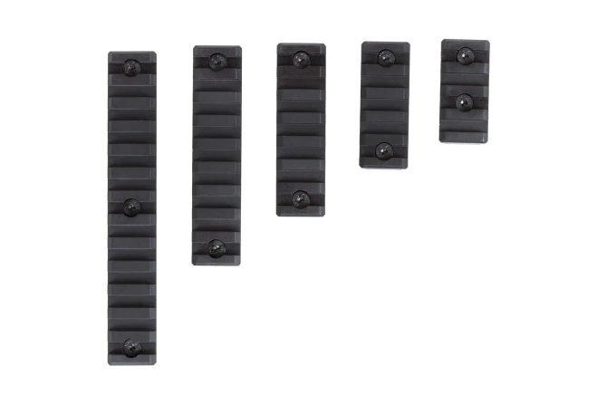 A set of 5 rails compatible with KeyMod rails, they have been made from durable aluminium. The rails have lengths of: