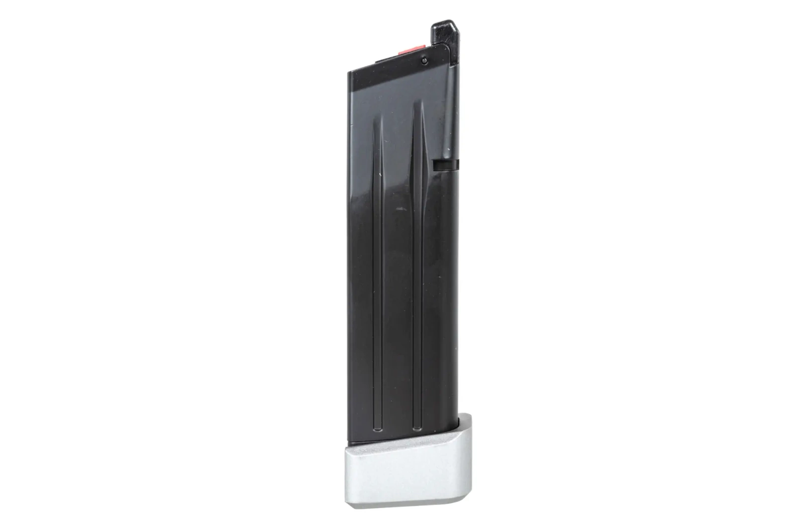 Green gas powered magazine, for SAI 2011 replicas. The model is made of durable aluminium which will translate into durability of the model. In addition to the metal casing, the magazine also has an enlarged footplate, which will facilitate the exchange. The magazine can hold 30 rounds and is compatible with, among others, Hi-Capa replicas from AW/TM/WE-Tech