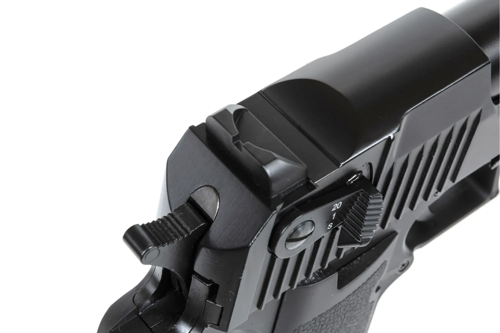 Thanks to the use of conjugated carbon dioxide as a source of propulsion, the replica has a reasonable initial discharge velocity of ~305 FPS. It is worth noting that a significant amount of gas is consumed with each firing to move the heavy slide. Thanks to this extremely spectacular blow-back system, the replica guarantees additional, unforgettable impressions with every shot.