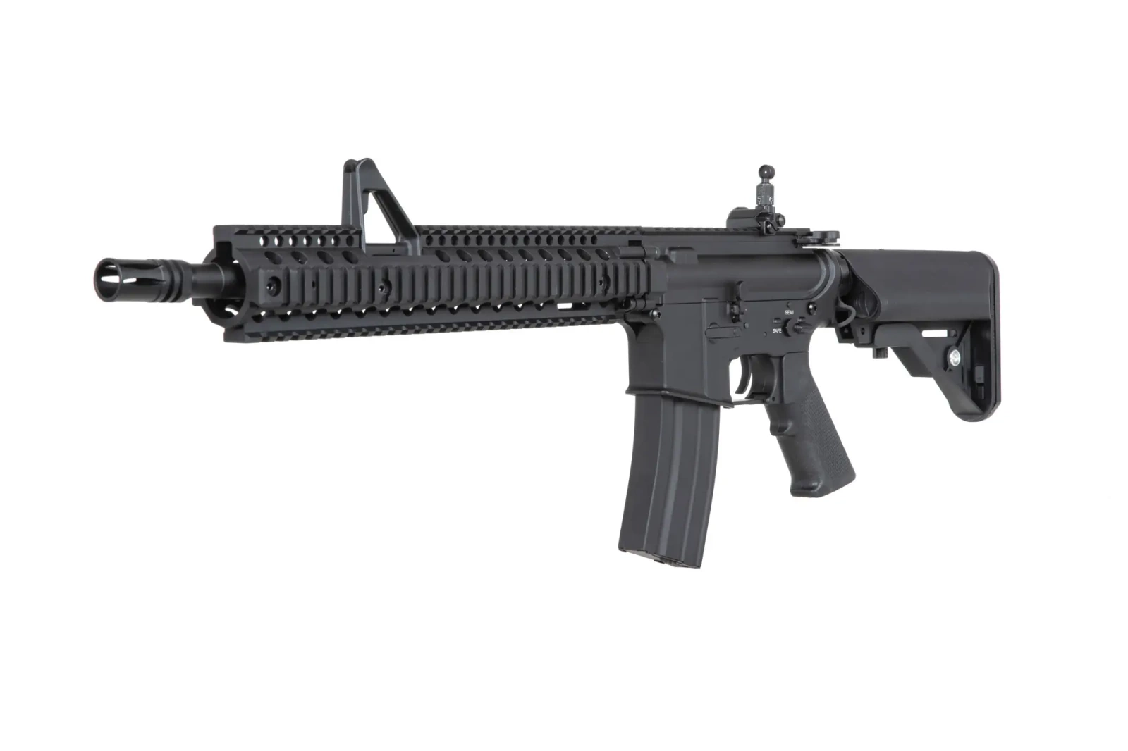 A replica of the popular M4 carbine manufactured by Double Bell. The model is characterised by good performance straight out of the box, the fit of the parts and the high quality of the materials used. The replica is mostly made of metal, including the body, barrel, flame suppressor, front ris and manipulators, while only the pistol grip and buttstock are made of polymer.
