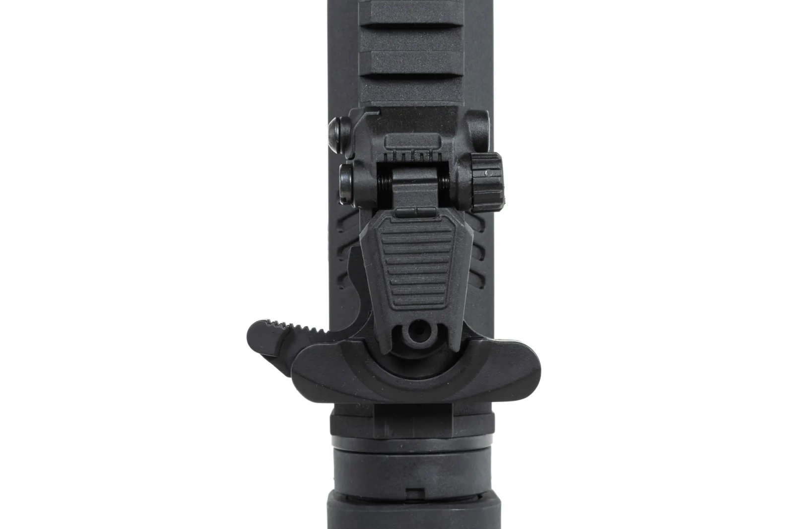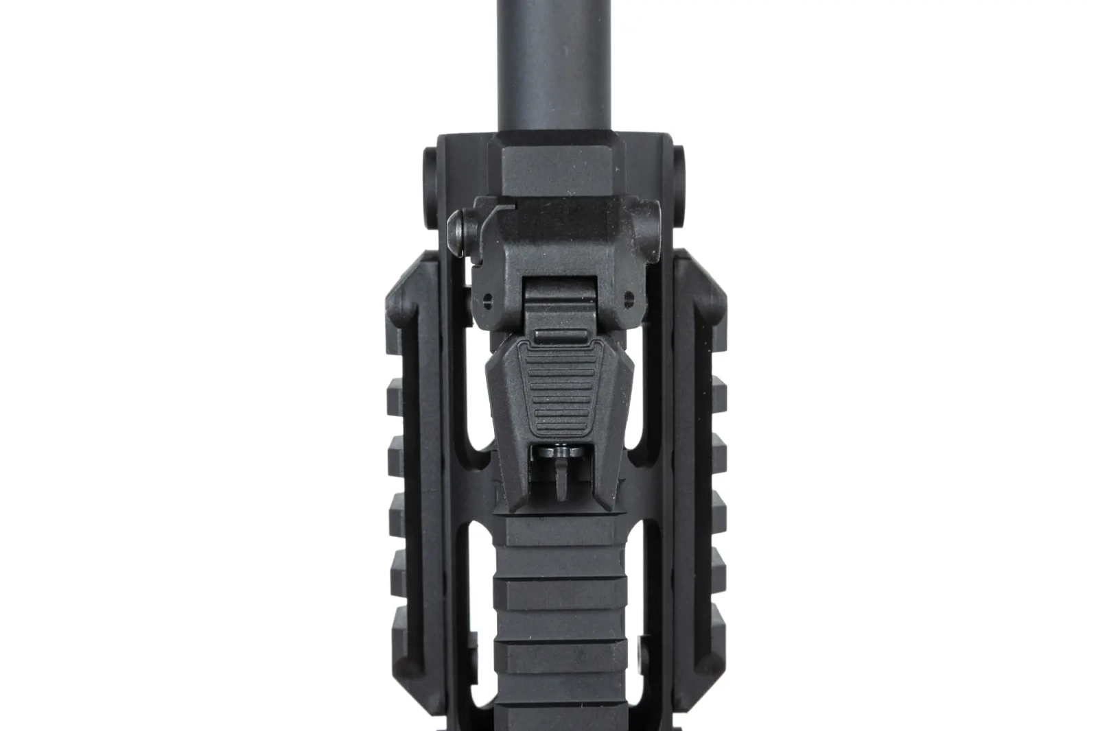 The SA-CX01 is equipped with a frontal M-Lok type RIS rail , with the barrel terminating in a standard discharge device. On the dorsal RIS rail, folding sighting instruments are mounted.