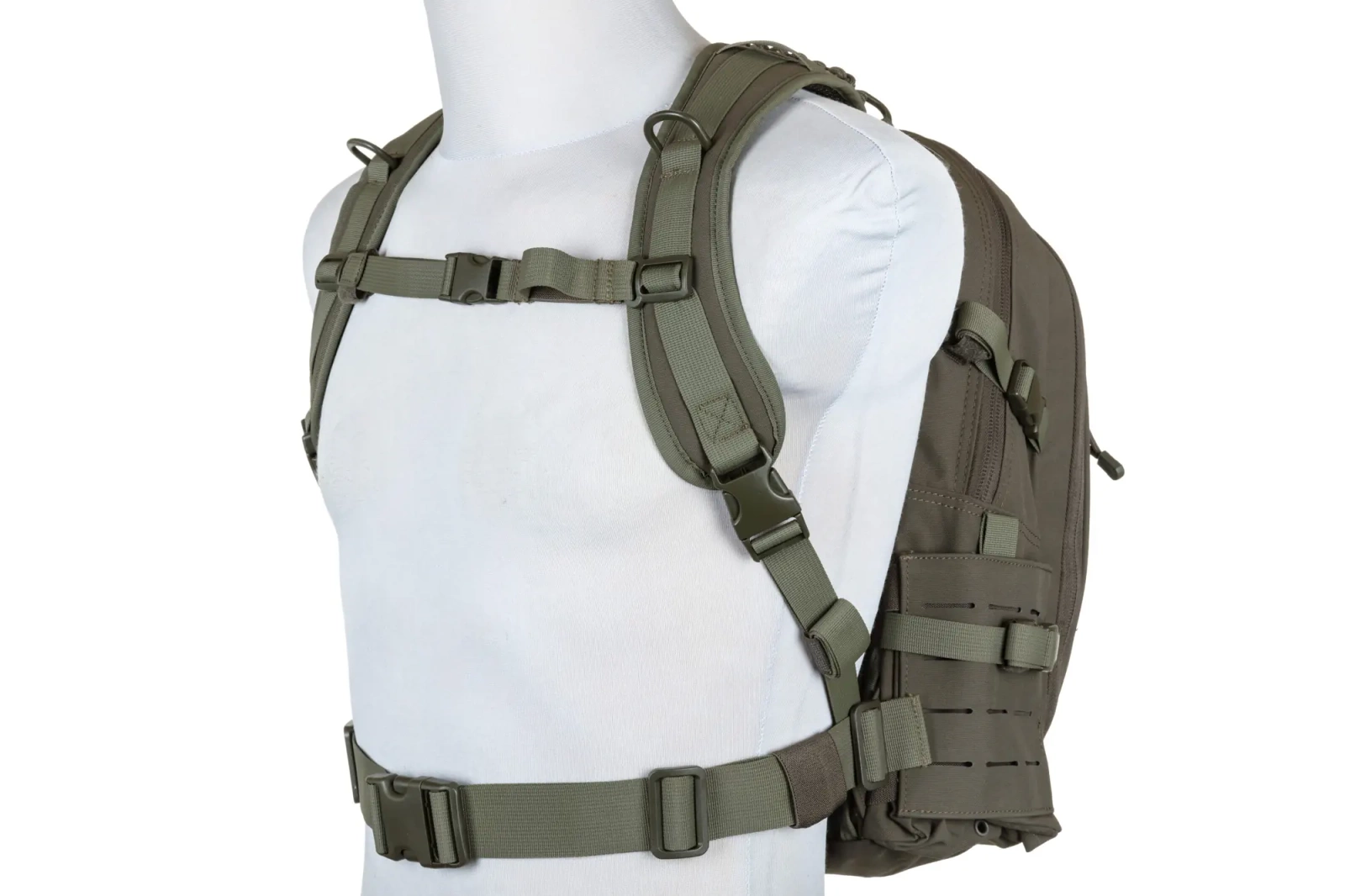 Reliable zips, front Molle panel Laser-Cut, patch or ID patch panel, side pockets that have Molle Laser-Cut panels on the front, adjustable waist belt, adjustable chest strap, additional compartment "on the back" for e.g. hydration cartridge, soft comfort-pads for the user's back comfort. The inside of the backpack is partially covered with Mesh fabric.