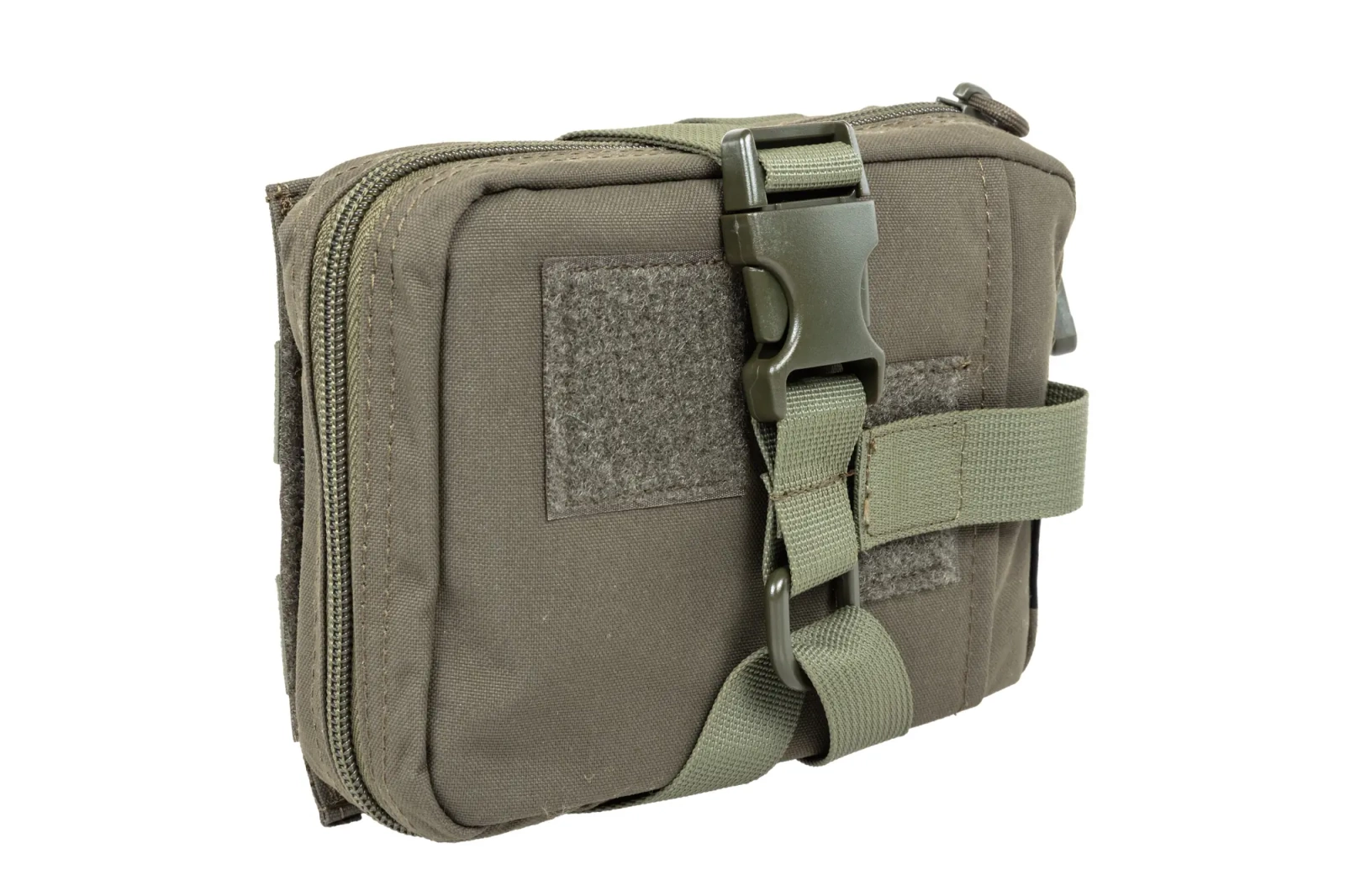 Thanks to a velcro panel on the back wall, the first aid kit can be quickly removed from the backpack or equipment without taking it off. Additional security is provided by a buckle strap and the front wall includes a Velcro pocket and patch panel.