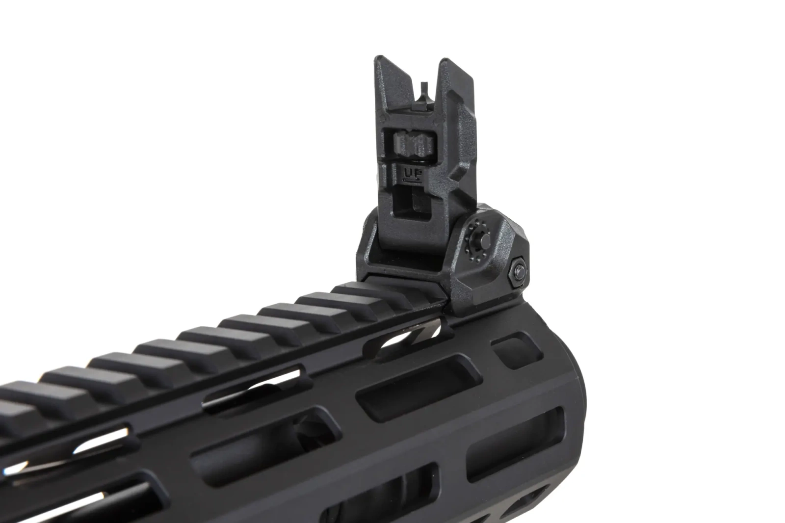 Aluminium is used for the 8-inch-long M-LOK handguard, the body of the replica including the dorsal RIS rail, 9.5 cm battery extension, reloading handle, external barrel. Made of durable polymer, the replica has an ergonomic pistol grip that has a rough surface, a sliding stock foot, a magazine with adjustable capacity, a trigger along with a bail, mechanical sighting instruments.
