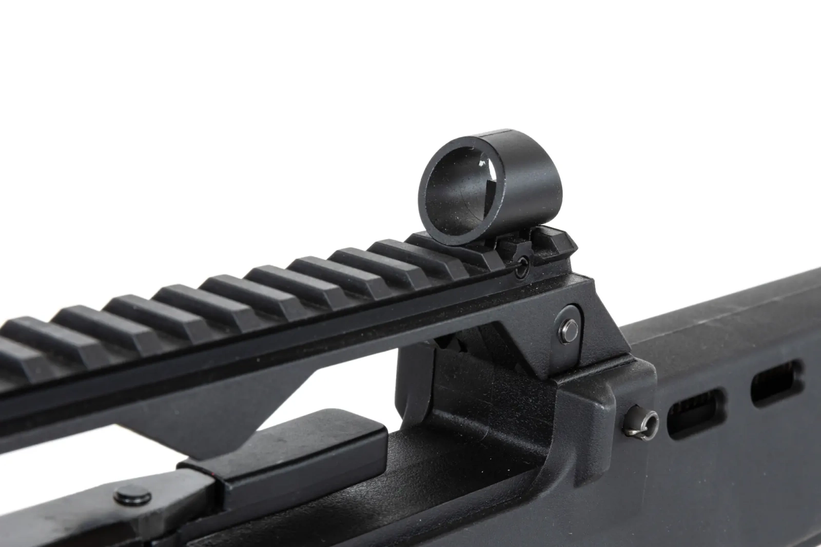 The airsoft SR36E2 carbine is modelled on the famous SR36E2 design and has RIS rails, which will allow the mounting of additional accessories such as a red dot sight, etc. The replica has a folding buttstock, which allows the carbine to be shortened by several tens of centimetres for easier transport. The reloading handle and fire selector are adapted for both left- and right-handed users.