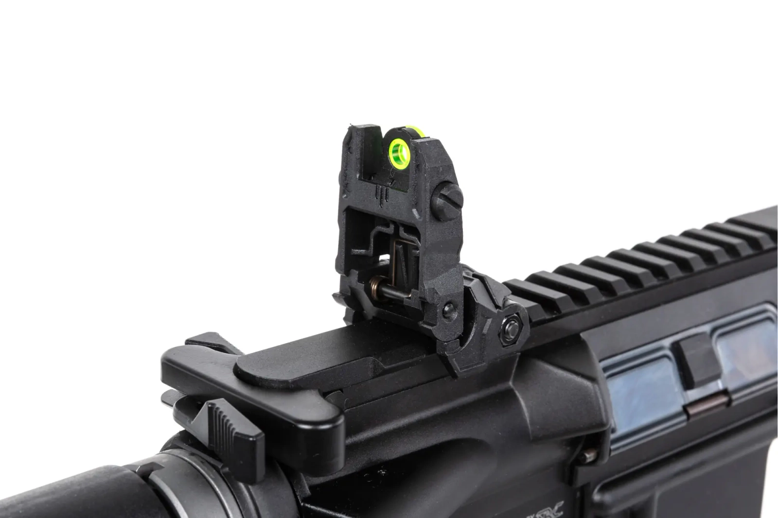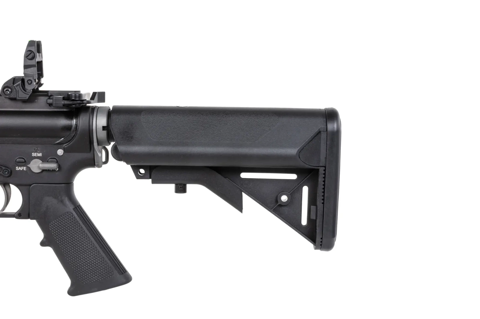 Aluminium is used for the body, M-LOK compatible handguard, dorsal RIS rail, external barrel, dummy gas block, stock guide, reloading handle on both sides, replica silencer and forward assist. Steel is used for the internal components, including slide, shell ejector plate, gas tube, manipulators, trigger guard, magazine, tactical sling assembly, all screws and pins. In addition, a pistol grip, adjustable stock and fibre-optic folding sights are made of durable polymer.