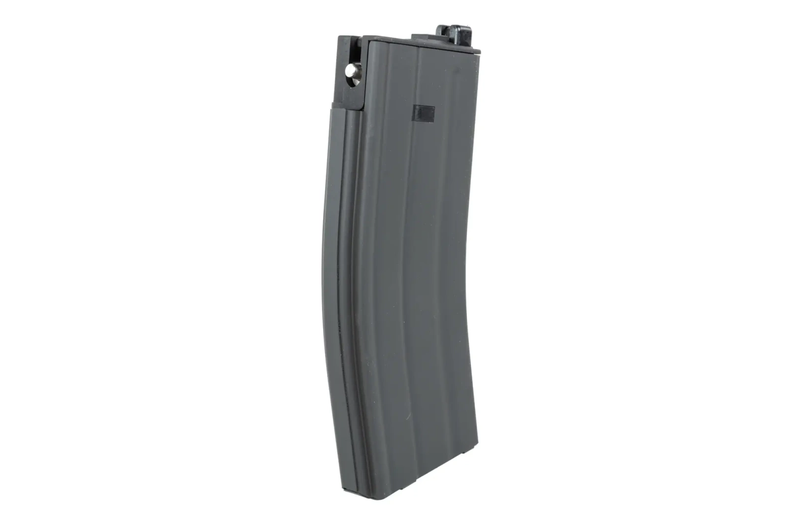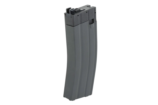 Magazine made of metal (including steel) and polymer, holds 35 BB BBs in 6mm calibre. The model is powered by green gas.