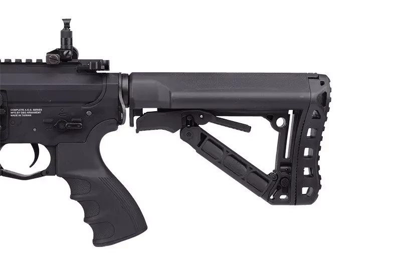 The replica has a telescopic stock with space for a battery. The stock is adjustable, which allows for customization of the replicas length to the body type and preferences of the user. The pistol grip is profiled in order to provide best possible hand placement. The flash hider sits on a 14 mm left hand thread.