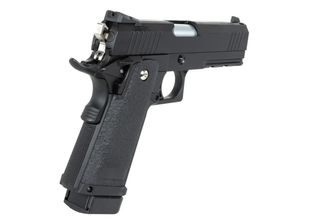 The pistol grip (made of polymer) has an ergonomic, rough texture that will make it easier to control the pistol. Of additional note is the interesting-looking, shellised trigger and the front of the bail, which also has a rough surface. It will be possible to comfortably rest a non-dominant hand on it while shooting. The use of a powerful blow-back system has also brought the use closer to its combustible counterpart - the system sets in motion a dummy breech, which retracts with each shot and remains in the rear position after emptying the magazine. This produces a "kick" effect on the replica and greatly enhances the experience and enjoyment of fire.