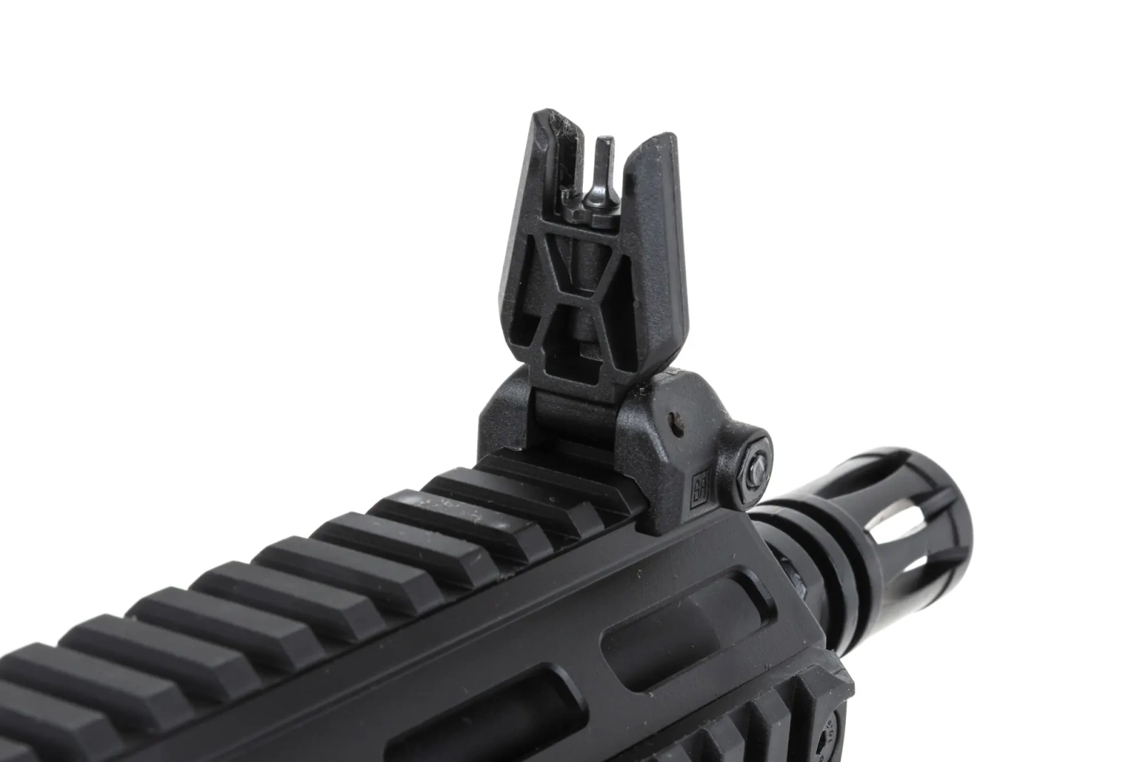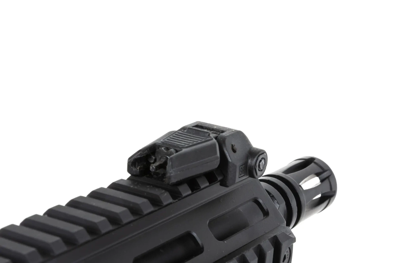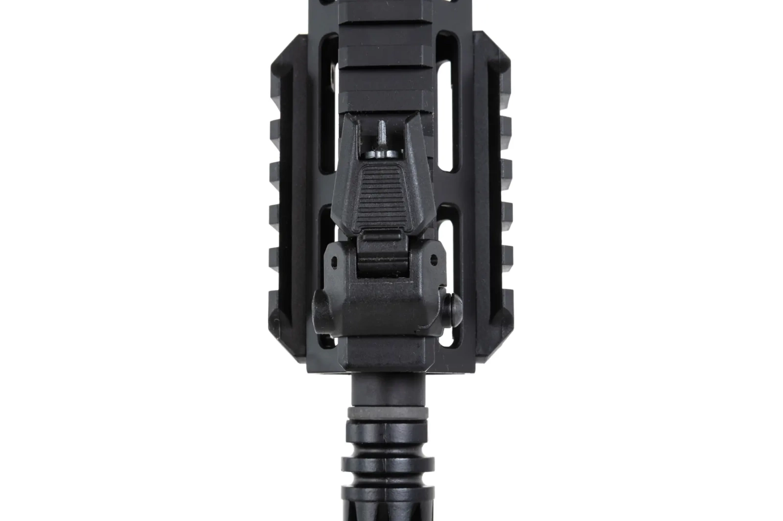The replica is equipped with a front M-LOK rail and an adjustable buttstock. A folding sight has been fitted on the upper RIS rail, which does not interfere with optoelectronic aiming devices. Thanks to the extendable buttstock finished with an anti-slip textured foot, it is possible to adjust the length of the replica to the build and the shooter's preferences. The standard flame suppressor is mounted on a 14-mm left-hand thread, which makes it possible to attach a sound suppressor in its place.