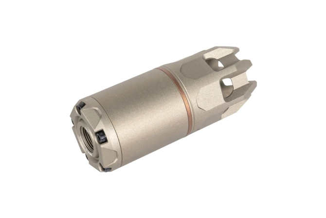 The Raider model was made using strong and durable aluminium. The surface has been anodised. It features an extremely interesting, aggressive design, which will allow any replica, which has a 14mm CCW thread, to stand out. The appearance and durability is only one of the advantages of the presented model - the main and most important feature is the internal Blaster M tracer, which will allow to intensify the experience during the exchange of fire. The Blaster M will allow you to illuminate green tracer BBs (and Gel BBs), allowing you to achieve an amazing visual effect, which will be particularly noticeable during night games. In addition, the 3 LEDs at the end of the tracer will allow you to illuminate the gases that escape from the barrel tube during firing - this will create an amazing impression that cannot be passed by indifferently (the effect will also be visible in AEG replicas, but will be slightly weaker). The model is powered by an internal rechargeable battery, which will allow for 12,000 to 24,000 shots (respectively tracer mode with Flame mode, Flame only mode - up to 12,000. Tracer only mode - up to 24,000).