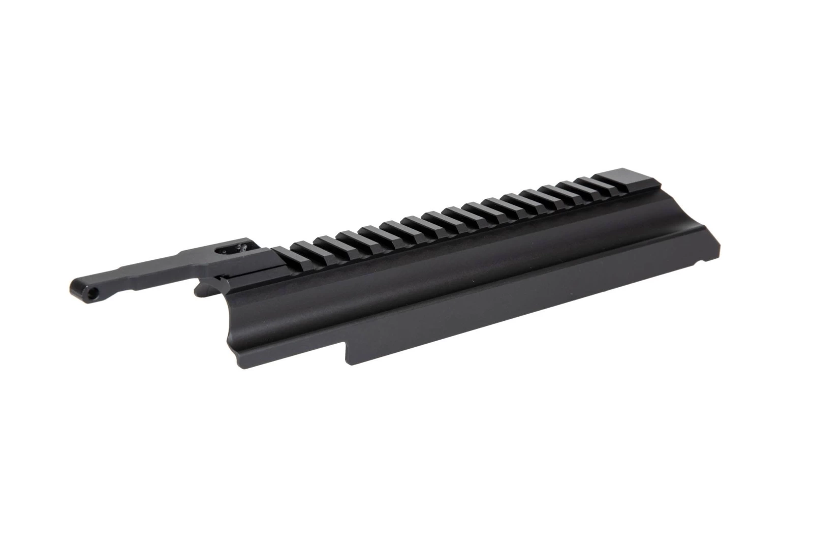 A steel and aluminum dust cover for AK type replicas. The dust cover is equipped with a 22mm RIS rail. The dust cover is mounted on the replica in the place of the rear sight.