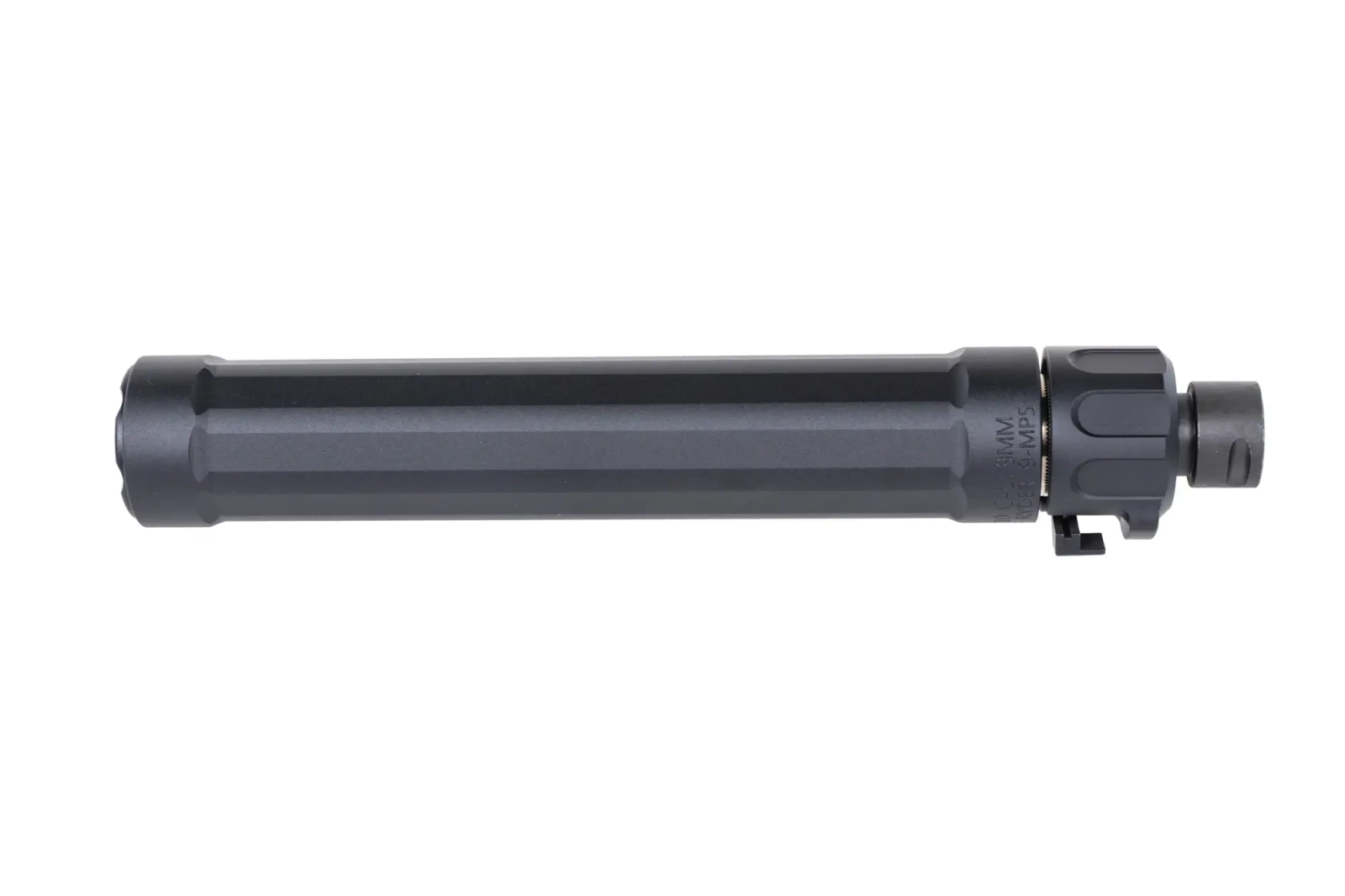 Made of aluminium, the sound suppressor from manufacturer 5KU. The model has a QD attachment that will allow quick connection to the outlet device that was added to the kit.