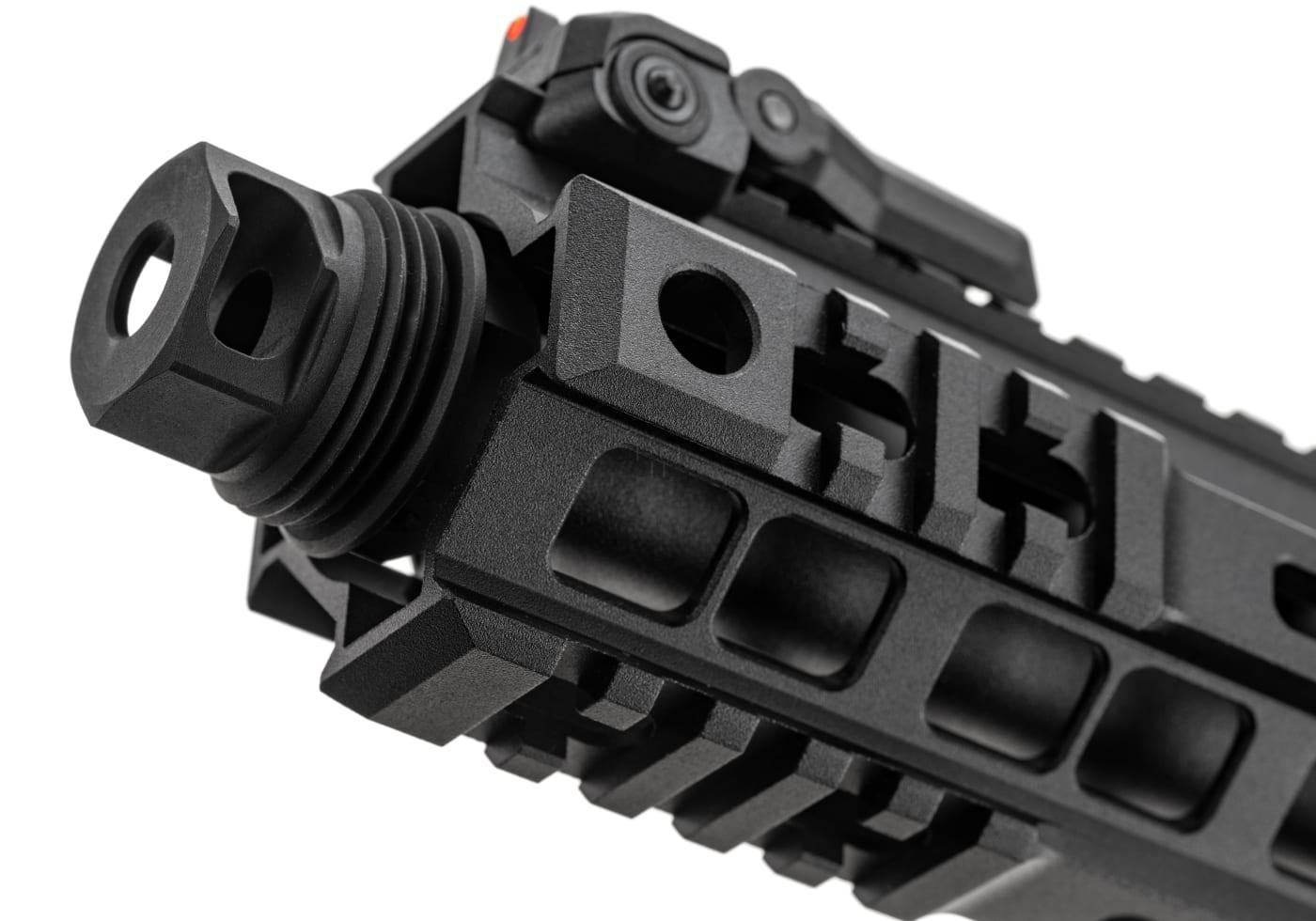 The replica's front is outfitted with a 7-inch-long M-LOK handguard with a single Picatinny rail on top and additional, smaller segments at 3, 6, and 9 o'clock positions. This allows the user to customize and personalize replicas to different setups, as well as personal, game, and mission requirements. Foldable, adjustable iron sights are included in the set.
