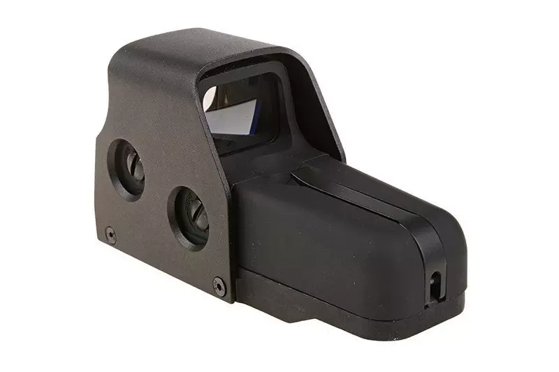 Replika wzorowana na konstrukcji popularnego celownika holograficznego stosowanego do broni palnej. Zamknięty w solidnej, wytrzymałej obudowie wykonanej praktycznie w całości z metalu, zapewniającej odporność na czynniki zewnętrzne. W komplecie znajdziemy także osłony na szkła. Punkt celowniczy może być wyświetlany w kolorze czerwonym bądź zielonym.