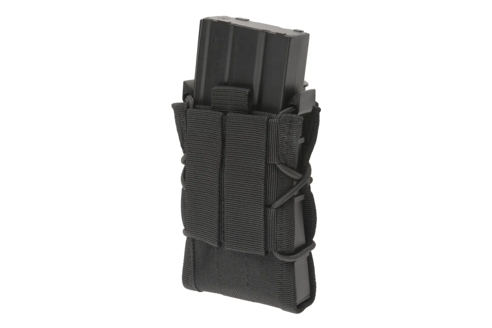 Attachable to equipment thanks to MOLLE system. The pouch does not have a traditional flap, which allows for rapid access to the magazine itself. The magazine itself is secured in place with side drawstrings, so the user does not have to worry about it accidentally falling out.