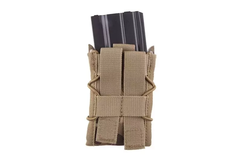 Attachable to equipment thanks to MOLLE system. The pouch does not have a traditional flap, which allows for rapid access to the magazine itself. The magazine itself is secured in place with side drawstrings, so the user does not have to worry about it accidentally falling out.