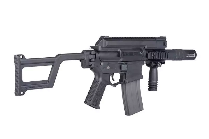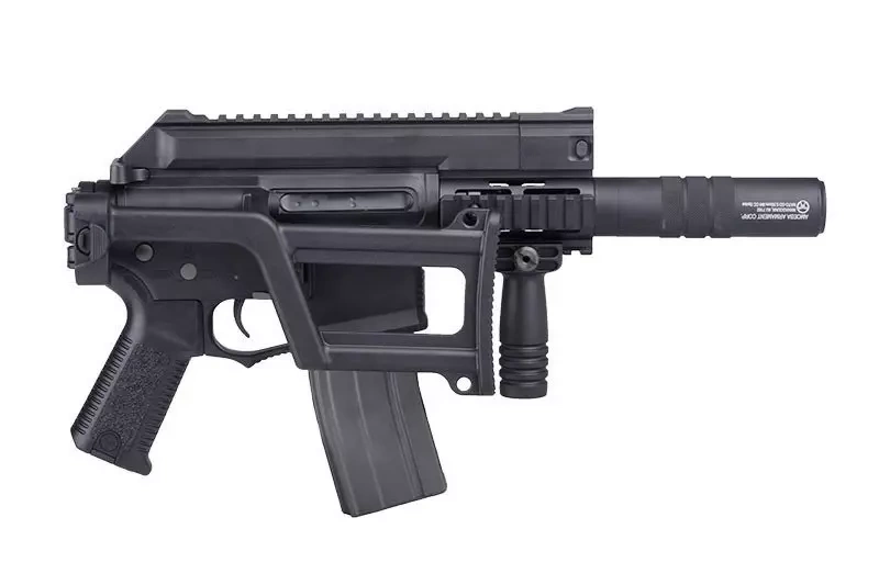 AM-005 features a top, 22mm RIS rail, which allows for attachment to the replica a wide array of additional accessories starting with optical sights and ending up with tactical flashlights. The replica has a set of fixed iron sights. In addition, it was equipped with a small RIS handguard that allows for the attachment of a forward grip (included in the set) or other additional accessories.