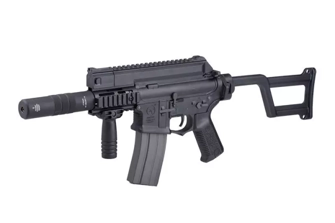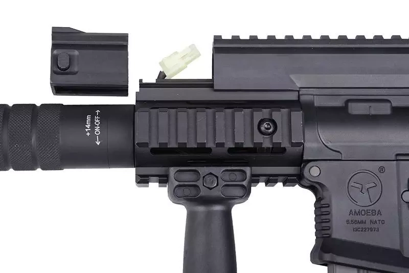 The replica’s body is made from a reinforced nylon. The quality of used materials makes it difficult to recognize at first glance that this is in fact polymer not metal. The body bears effectively looking markings, among others, the model, caliber and Amoeba Airsoft logo. Metal parts include the outer barrel, thread cover and small elements. The pistol grip is appropriately profiled and covered with rough, anti-slip texture, which provides a more sure and stable grip. The integrated with the front forward grip improves maneuverability in CQB. Magazine release button was enlarged in order to ease the usage.