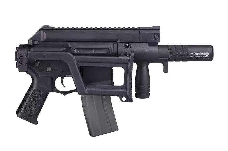 The replica’s body is made from a reinforced nylon. The quality of used materials makes it difficult to recognize at first glance that this is in fact polymer not metal. The body bears effectively looking markings, among others, the model, caliber and Amoeba Airsoft logo. Metal parts include the outer barrel, thread cover and small elements. The pistol grip is appropriately profiled and covered with rough, anti-slip texture, which provides a more sure and stable grip. The integrated with the front forward grip improves maneuverability in CQB. Magazine release button was enlarged in order to ease the usage.