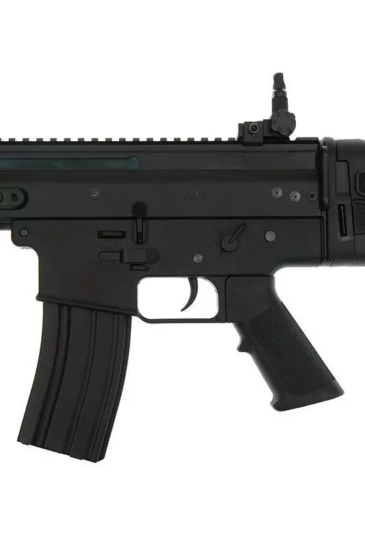 Replica is made mostly of strong and durable nylon. Ris rails, barrel, iron sights and magazine are made of metal. Folding stock with rubber cap is adjustable and storages battery.   Replica uses standard M4/M16 magazines. Magazine catch and fire selector work both sides, what makes it perfect assault rifle for left and right-handed. Flip-up iron sights are adjustable and made of metal.